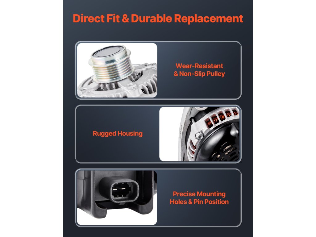 Csere generátorunk tiszta réz tekercsekkel rendelkezik, amelyek az alumíniumnál jobb tartósságot biztosítanak. Az alumínium ház és a hűtőventilátor növeli a hőelvezetést. Stabil 150 amperes kimenetet biztosít a nagy terhelésű berendezések, például a légkondicionáló és a prémium audio rendszerek támogatásához.
