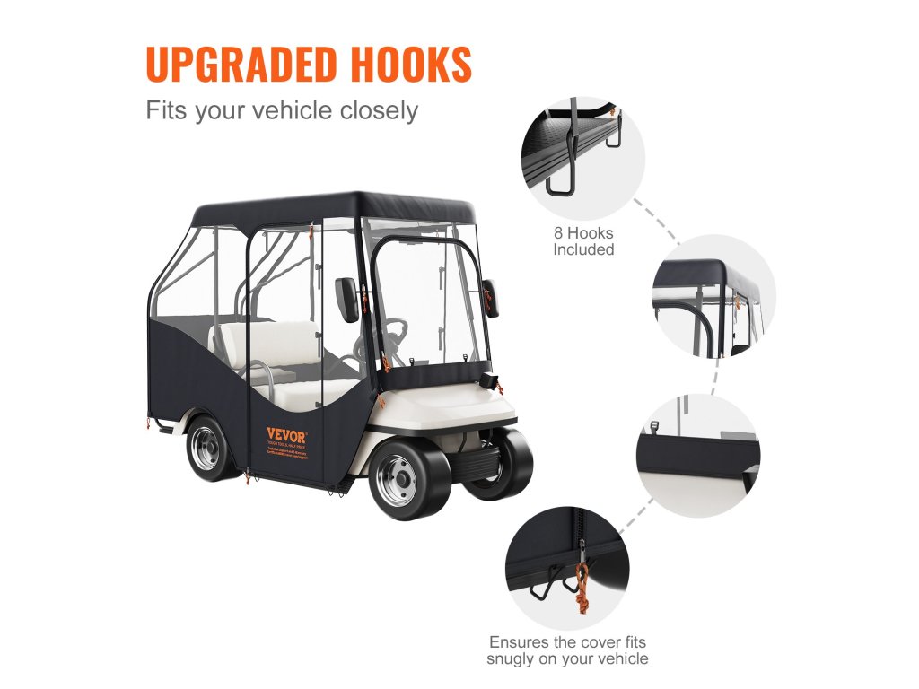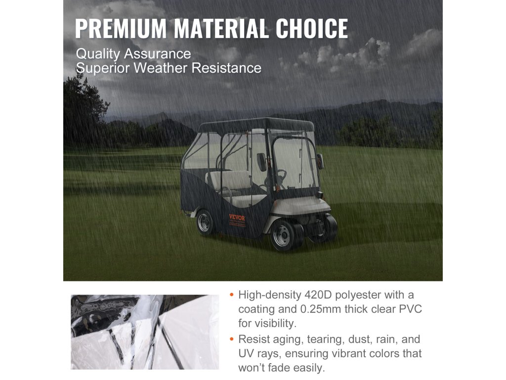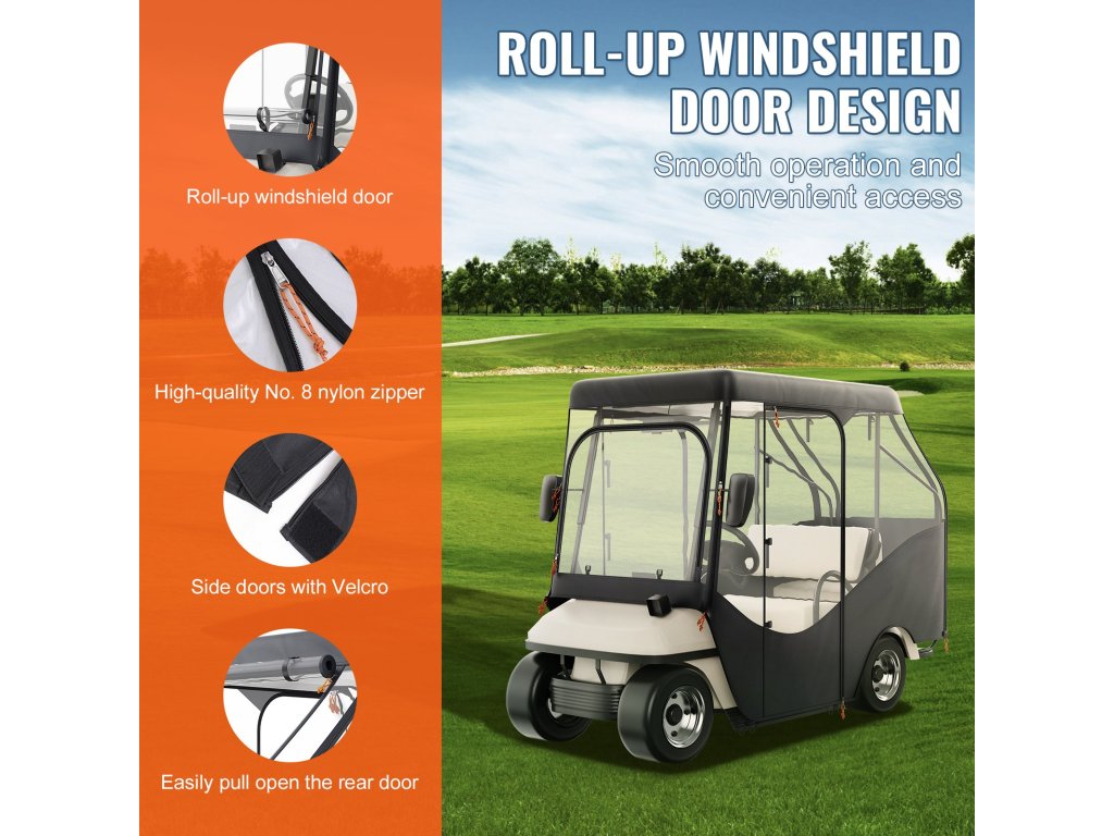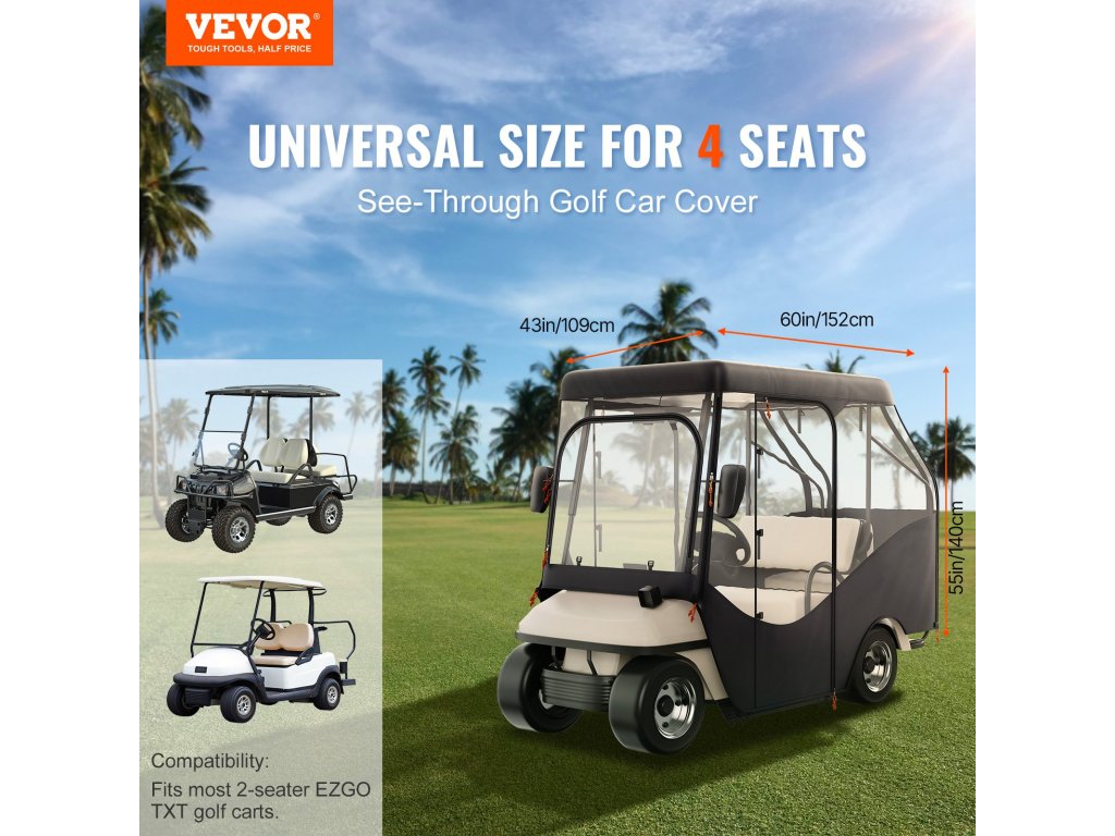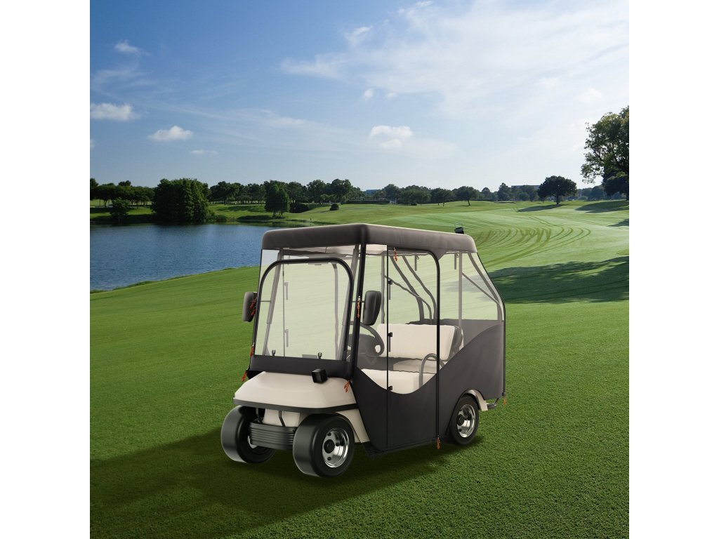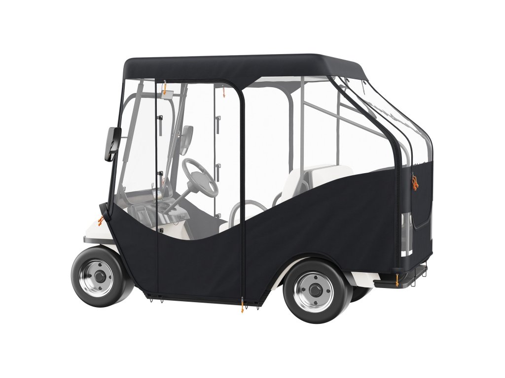 Ez az áttetsző golfkocsi borítás alkalmas a 2 vagy 4 üléses Yamaha, EZGO és Club Car járművekhez, amelyek nagy teherbírásúak, beleértve a 2+2 kocsit is, hátsó összecsukható ülésekkel.