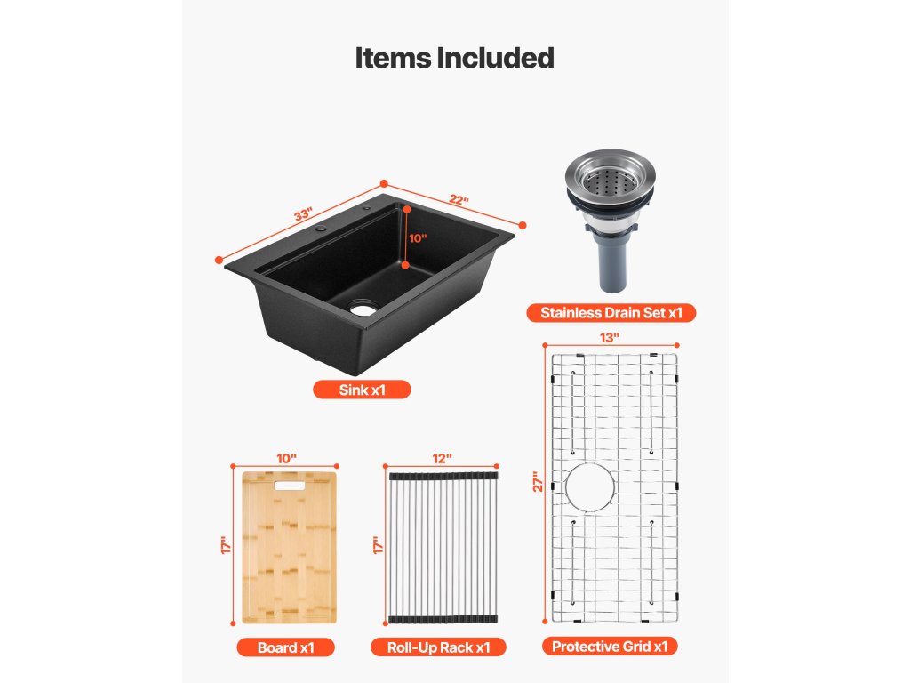 | Vonkajšia veľkosť drezu | 33x22x10 palcov / 840x560x250 mm |
