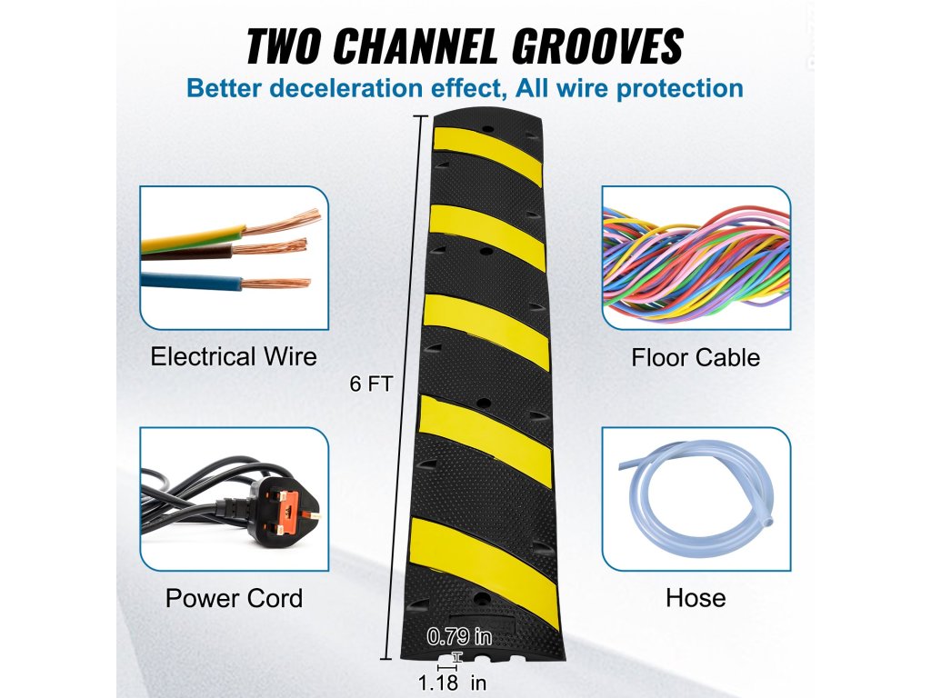 Rýchlostný prah je vybavený dvojkanálovým dizajnom. Každý kanál má rozmery 1,18 x 0,79 palca. Tento dizajn umožňuje efektívne riadenie káblov. Poskytuje bezpečný a organizovaný spôsob vedenia káblov. Kanály chránia káble pred poškodením spôsobeným vozidlami. Konštrukcia zabezpečuje, že káble zostanú nepoškodené a funkčné. Táto rýchlospojka s nosnosťou 22 000 libier je ideálna pre dátové centrá, štúdiá a iné priestory s intenzívnym používaním káblov. Tieto kanály sú ľahko prístupné a použiteľné (t. j. ovládanie káblov je jednoduché a efektívne). Dvojkanálová konštrukcia dodáva rýchlobrzde všestrannosť.