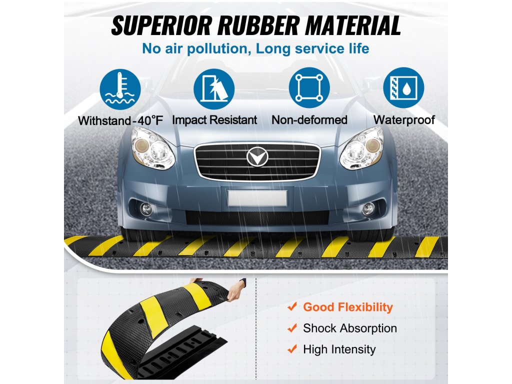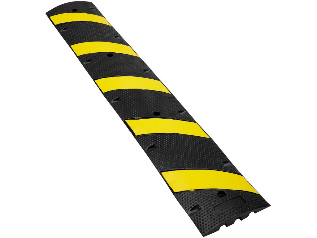Gumový 72-palcový rýchlostný nárazník VEVOR je skonštruovaný tak, aby zabezpečoval bezpečnosť a odolnosť. Je vyrobený z vysoko kvalitnej gumy. Tento materiál je odolný voči opotrebovaniu. Odolá teda nízkym teplotám a je vodotesný. Okrem toho je rýchlostný valec pružný, ale zároveň pevný. Môžete ho používať v náročných podmienkach. Vďaka čierno-žltému dizajnu je dobre viditeľný. To znamená, že vodiči si ho všimnú a spomalia. S dĺžkou 72 palcov je pokrytie dostatočné. Na ochranu káblov a hadíc tento rýchlobrzda ponúka spoľahlivú ochranu pre rôzne aplikácie. Je ideálny na použitie v obytných aj komerčných priestoroch.