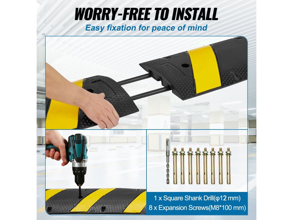 Inštalácia gumového rýchlostného prahu je jednoduchá. Spojiteľný dizajn umožňuje spojiť viacero jednotiek. To zaručuje, že môžete pokryť akúkoľvek šírku cesty. Každý 2-kanálový rýchlostný hrboľ sa dodáva s montážnymi otvormi. Môžete ho pripevniť k zemi pomocou dodaných skrutiek. Vďaka tomu zostane na svojom mieste. Proces inštalácie je rýchly a jednoduchý, čo vám umožní nastaviť tento gumový rýchlostný hrboľ bez odbornej pomoci. Pripojiteľný dizajn je flexibilný a prispôsobí sa rôznym podmienkam na ceste. Máte tak k dispozícii bezpečnú a stabilnú inštaláciu.
