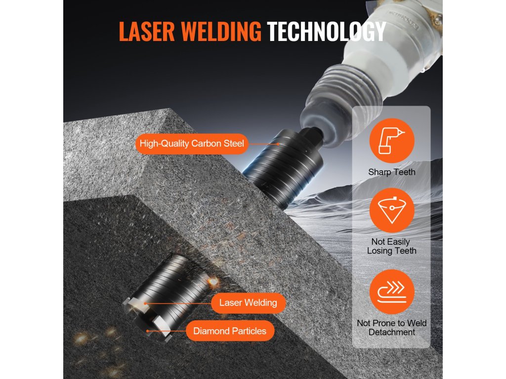 A lézerhegesztési technológia kivételes kopásállóságot és magas hőmérsékleti stabilitást biztosít a gyémánt magfúrófejnek, így ideális a legkülönbözőbb körülmények között történő fúráshoz, még magas hőmérsékletű környezetben is. Kevésbé hajlamos a fogvesztésre és a hegesztés leválására, ami a szerszám élettartamának növekedését eredményezi.