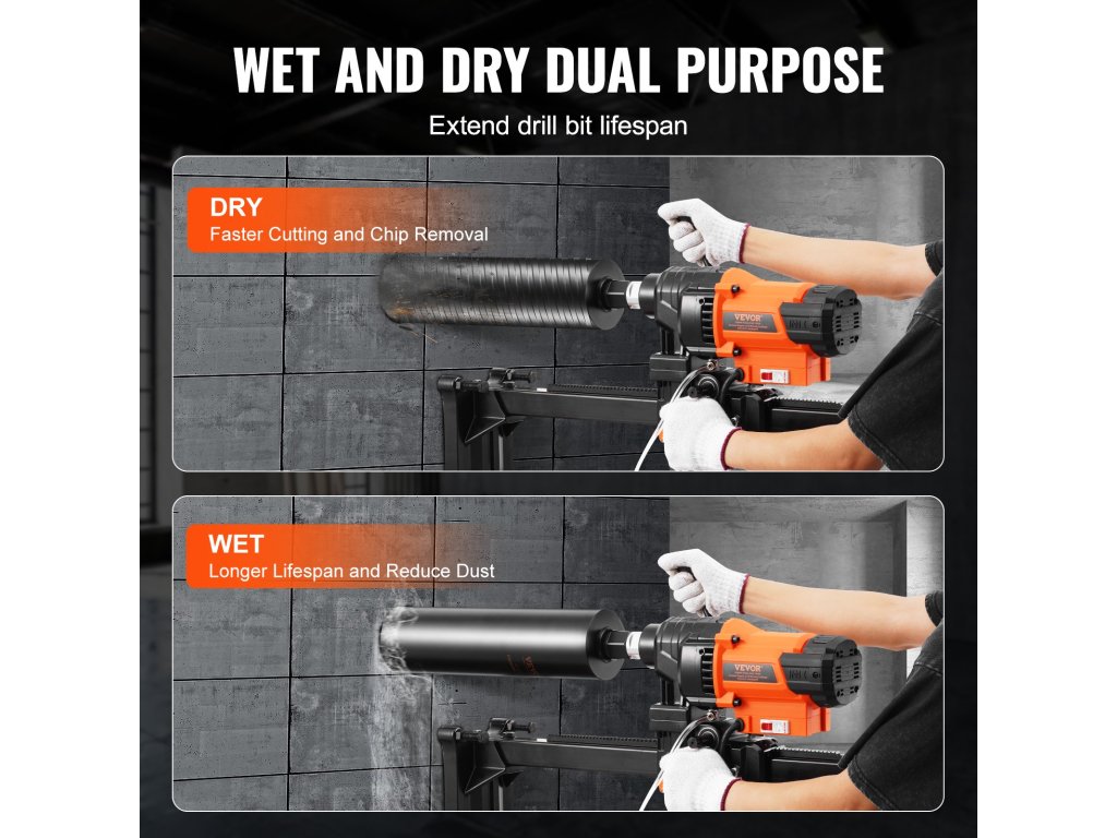 Tapasztalja meg a kiváló vágási sebességet és a törmelék eltávolítását a száraz vágási módnak köszönhetően. A nedves vágási üzemmód csökkenti a por és a túlmelegedés mértékét működés közben, növelve a biztonságot és a kényelmet a munkakörnyezetben. Emellett segít csökkenteni a szerszámkopást, meghosszabbítva ezzel a magfúrógép élettartamát.