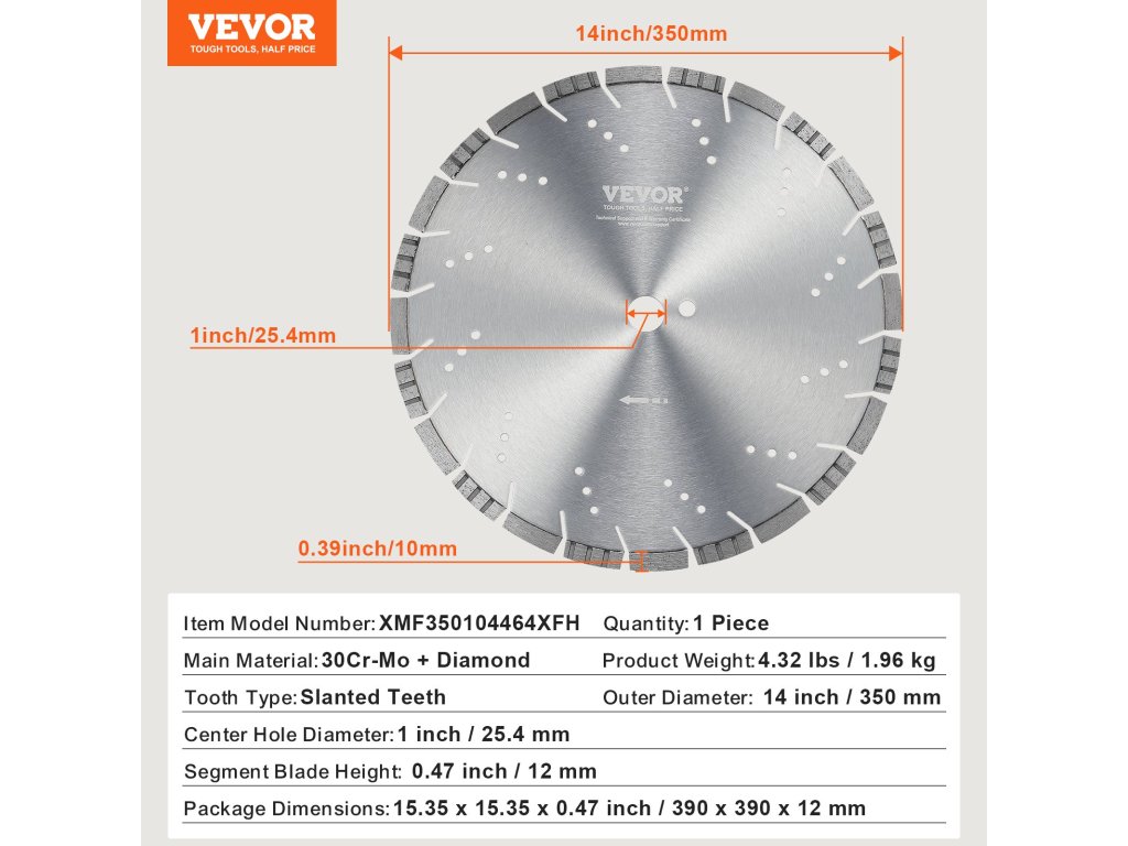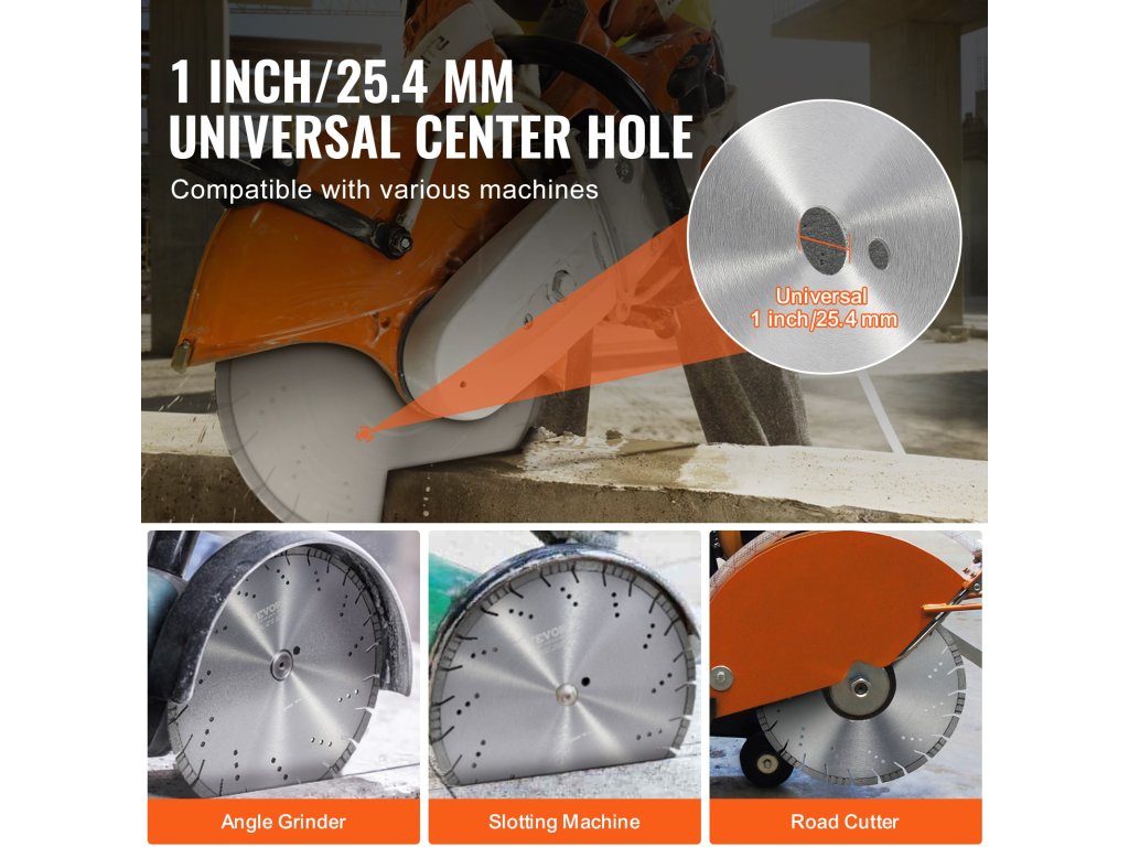Gyémánt betonlapunk univerzális, 1 hüvelyk/25,4 mm átmérőjű középső furattal rendelkezik, amely kompatibilis a piacon kapható legtöbb berendezéssel. Könnyen alkalmazkodik, legyen szó akár az építkezéseken az utak barázdálásáról, akár a járdalapok vágásáról a mindennapi javítások során.