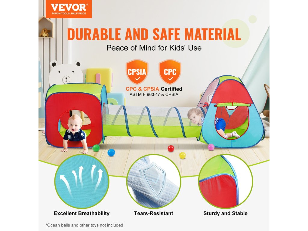 A puha poliészterszövetből és erős acélhuzalos tartóból készült alagút kényelmet és stabilitást biztosít, valamint megfelel a CPSIA-szabványoknak és a CPC-tanúsítványnak, így a gyermekek biztonságosan játszhatnak az alagútban.