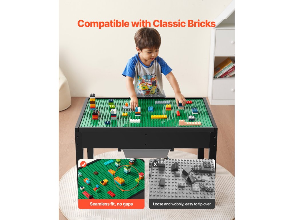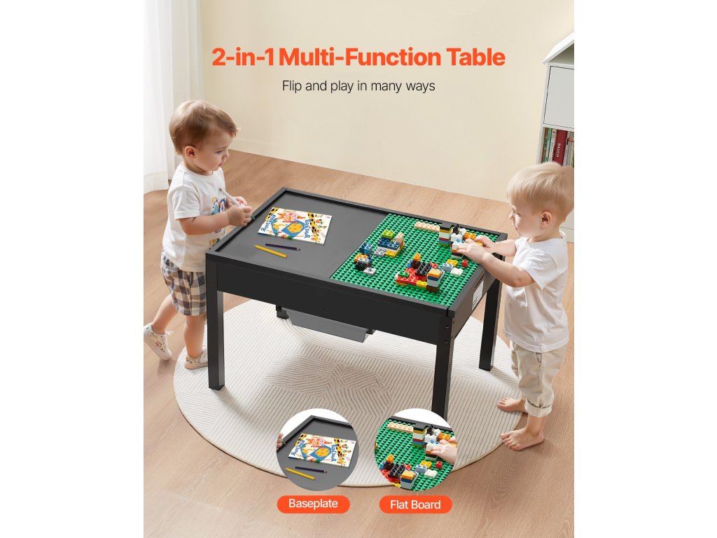 Ez a készlet megfordítható asztallappal is rendelkezik, amely az egyik oldalon tökéletesen alkalmas a blokkokkal való játékra, a másikon pedig a kézműveskedésre és az étkezésre. Az építőkocka asztalunk kiváló minőségű fából készült, és kiválóan alkalmas a koordináció fejlesztésére és hosszú távú használatra.