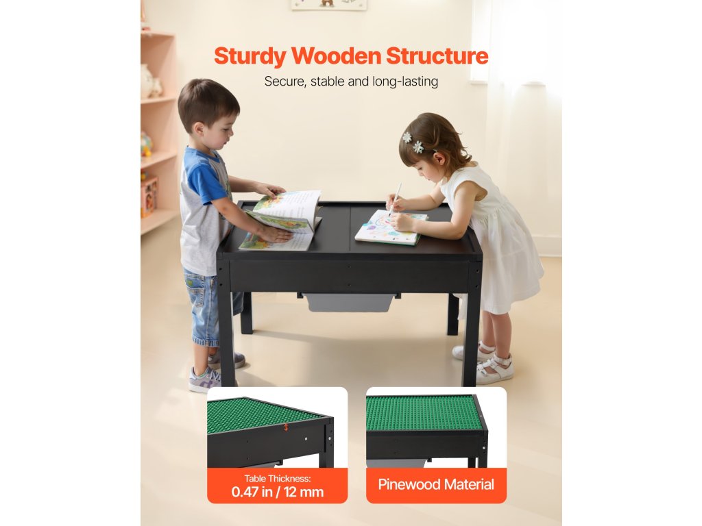 A kisgyermek játszóasztal lekerekített sarkokkal rendelkezik, hogy a kicsik biztonságban legyenek. Stabil asztal a hosszú távú használathoz, a polírozott fa felülete pedig sima, így biztosítva, hogy nem keletkeznek rajta forgácsok vagy karcolások. A szülők nyugodtan pihenhetnek a biztonság tudatában.