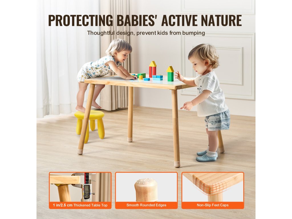 Gyermekjátszóasztalunk asztallapja és lábai prémium minőségű fenyőfából készültek, simára csiszolva, éles sarkok és görcsök nélkül. A 1/ 2,5 cm vastag asztallap maximum 66 font/30 kg súlyt bír el, és együtt nő gyermeke egészségével.