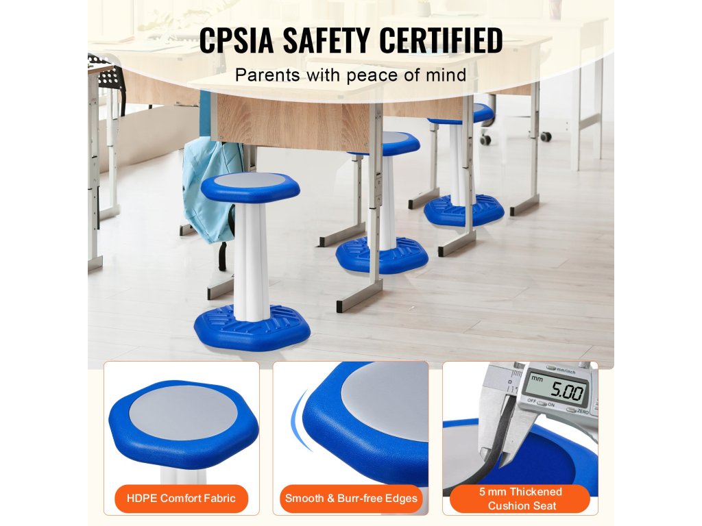 Az aktív szék kiváló minőségű, CPSIA tanúsítvánnyal rendelkező HDPE anyagból készült, és sima, csiszolatlan élekkel rendelkezik, ami biztosítja a gyermekek biztonságát az ütődésektől vagy sérülésektől. A kényelmet fokozza az 5 mm vastag párna, amely kényelmesebbé teszi az ülést még hosszabb ideig tartó ülés esetén is.