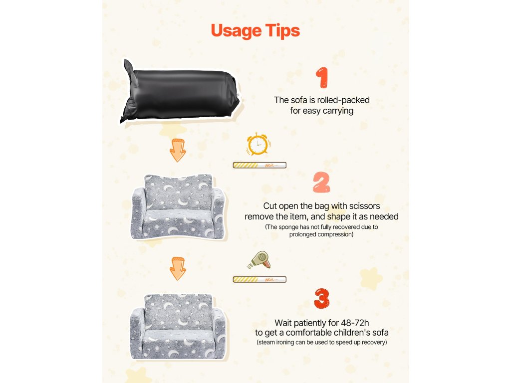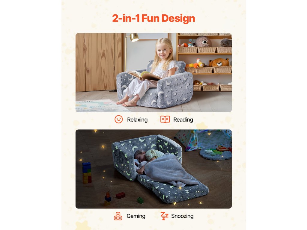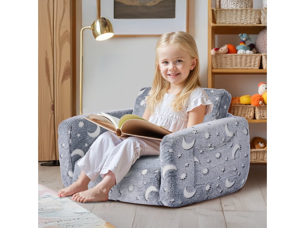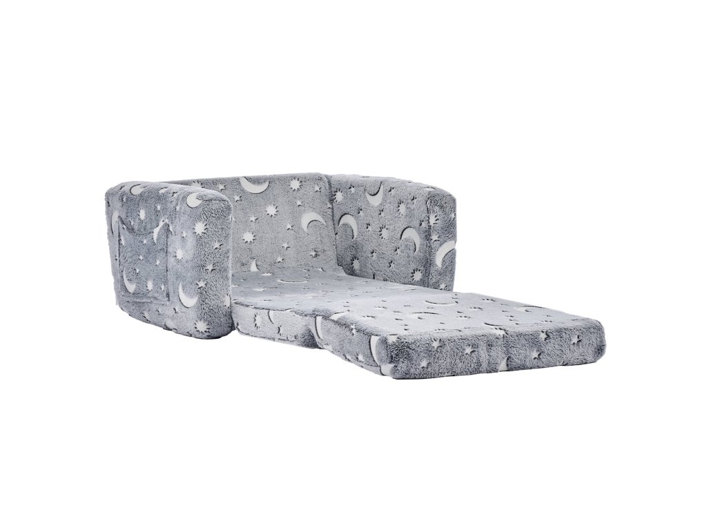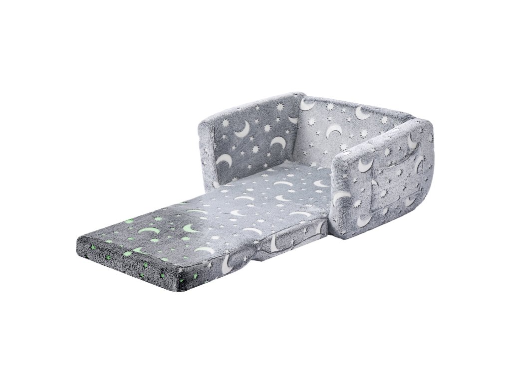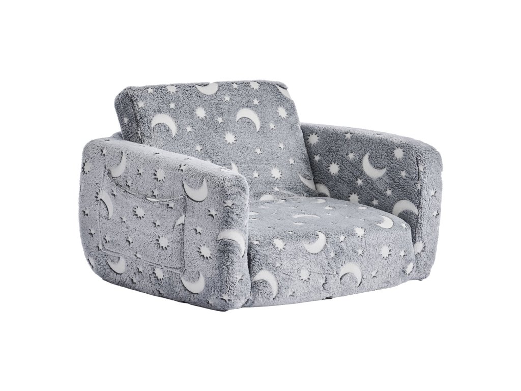 Ez a gyermekkanapé hangulatos és játékos helyet biztosít a gyermekek számára pihenéshez, játékhoz vagy kikapcsolódáshoz. A puha flanelszövetből készült, sötétben világító mintákkal ellátott kanapé legalább annyira szórakoztató, mint amennyire kényelmes. Rendkívül tartós 28D habszivaccsal van töltve, amely egész nap puha alátámasztást biztosít