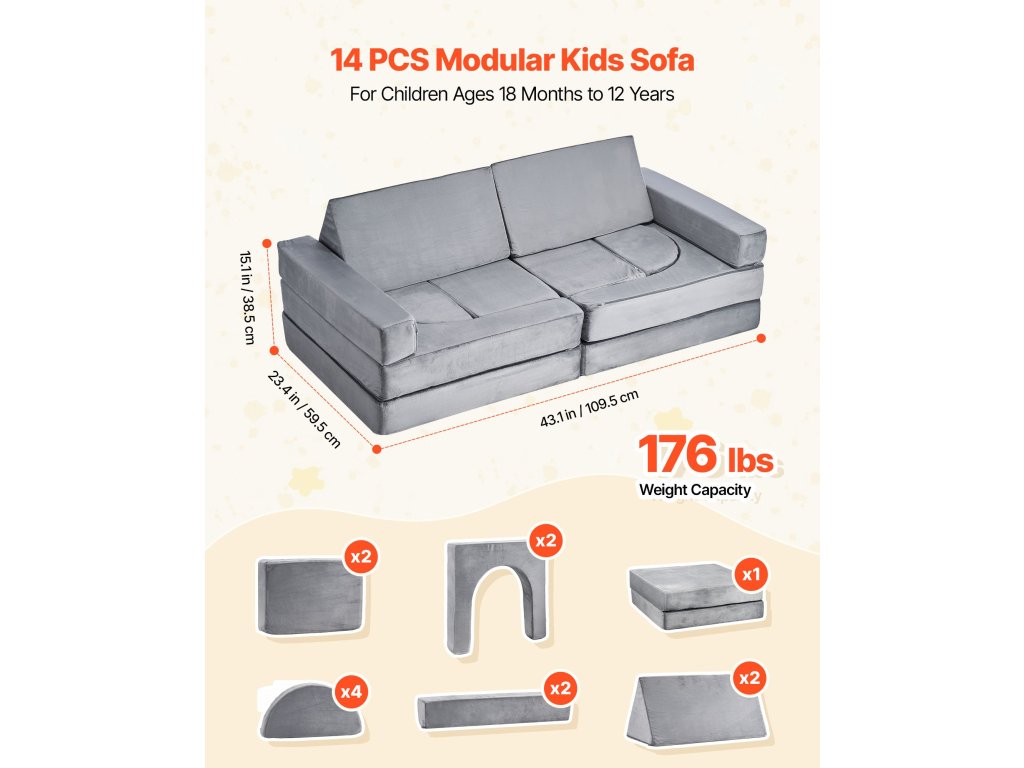 Gyerek moduláris kanapé 14 részes, 28D habszivacs, karfákkal, szürke