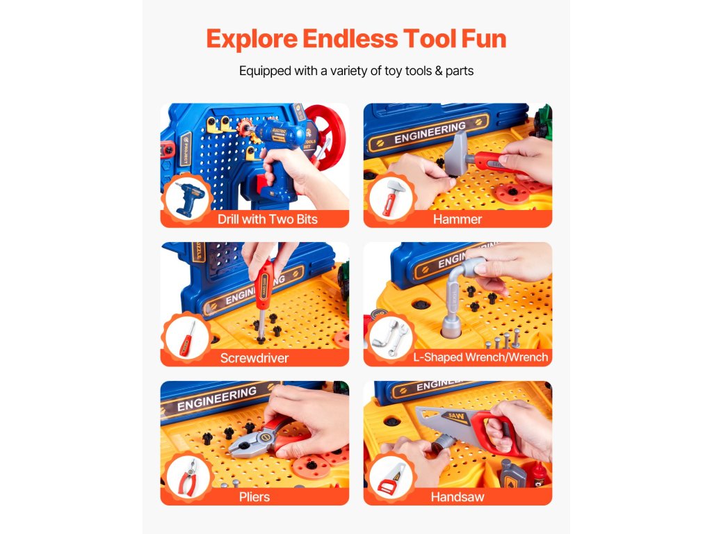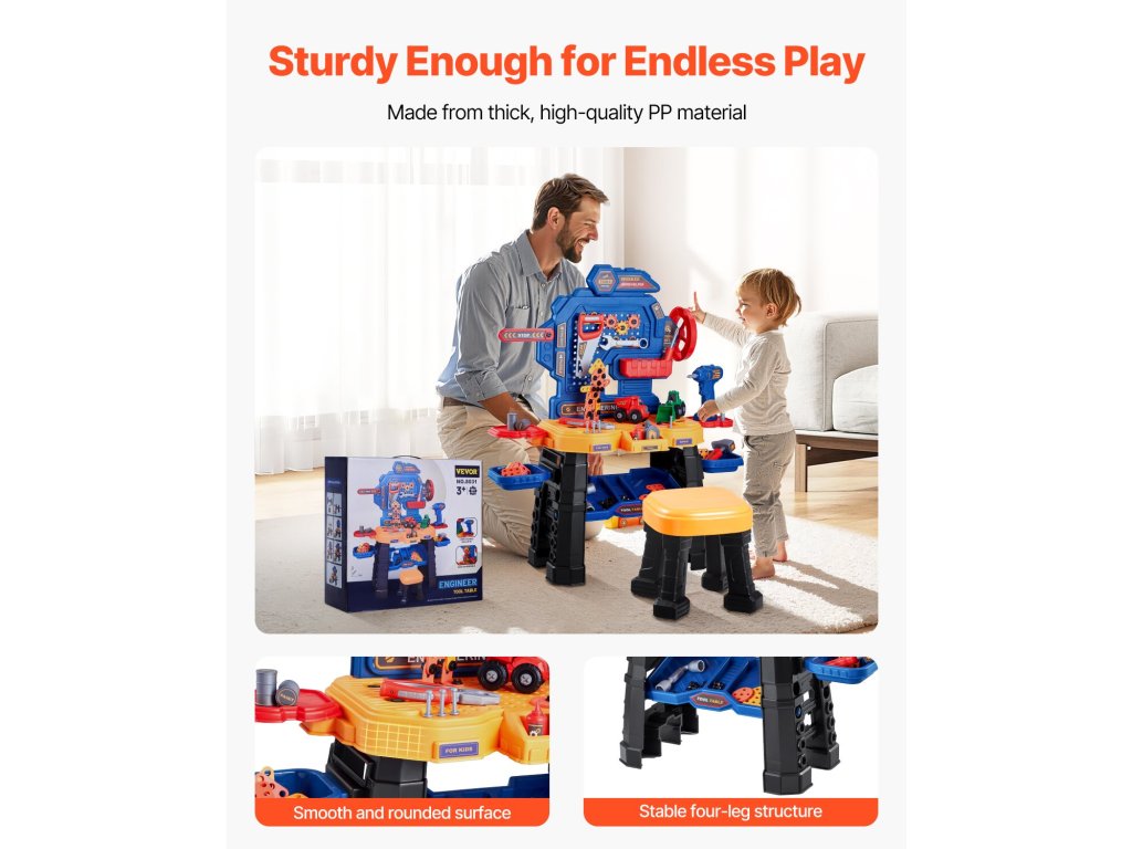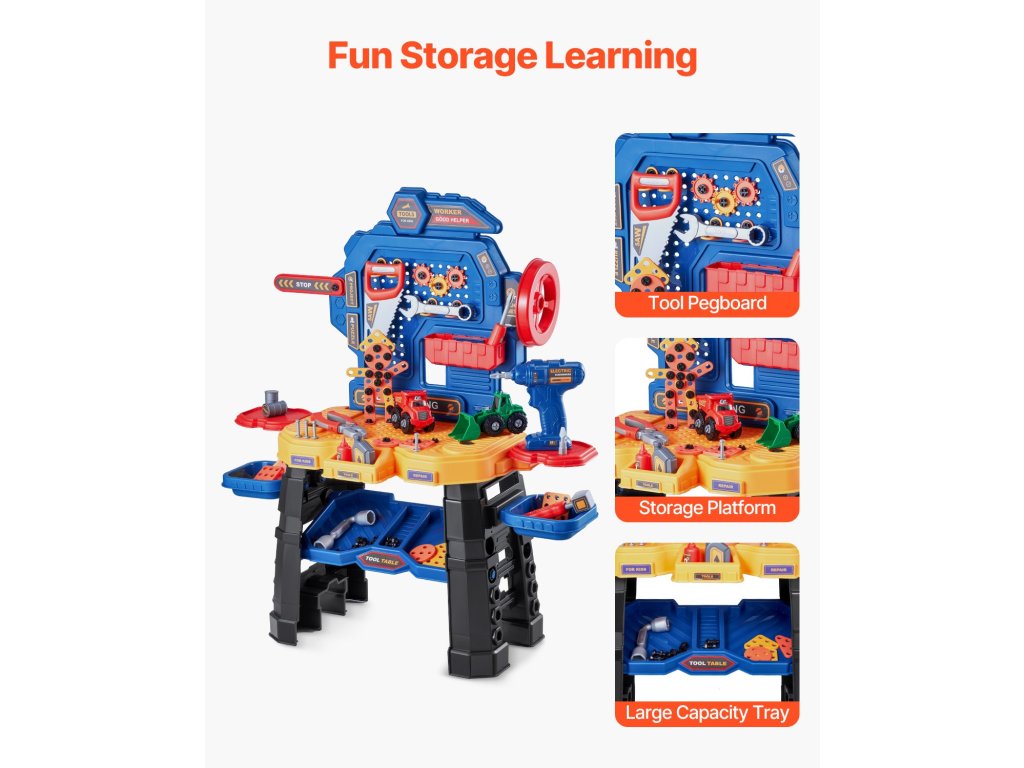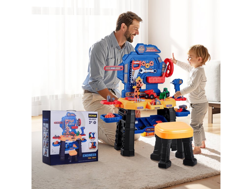 Hagyd, hogy a kisgyermeked kézművest játsszon! A játék fúrógép, csavarkulcs, fűrész és még sok más eszköz segítségével a gyerekek megtanulják, hogyan kell használni a valódi szerszámokat. A kisgyermekes munkapadunkon található barkácsmatricák lehetővé teszik számukra, hogy testre szabhassák munkaterületüket a végtelen szórakozás és kreativitás érdekében.