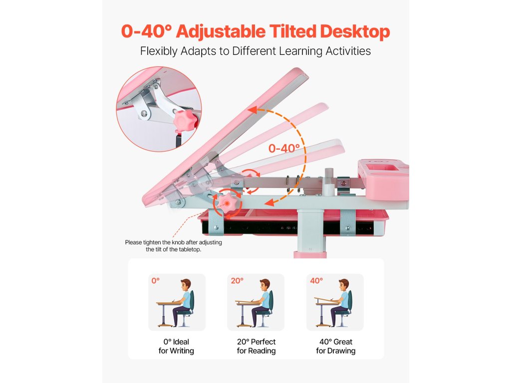 Az asztallap könnyen dönthető 0° és 40° között, hogy írni, olvasni vagy rajzolni lehessen. Ez a rugalmasság nemcsak a különböző tevékenységekhez igazodik, hanem támogatja gyermekét az egészséges és helyes ülésmód fenntartásában is.