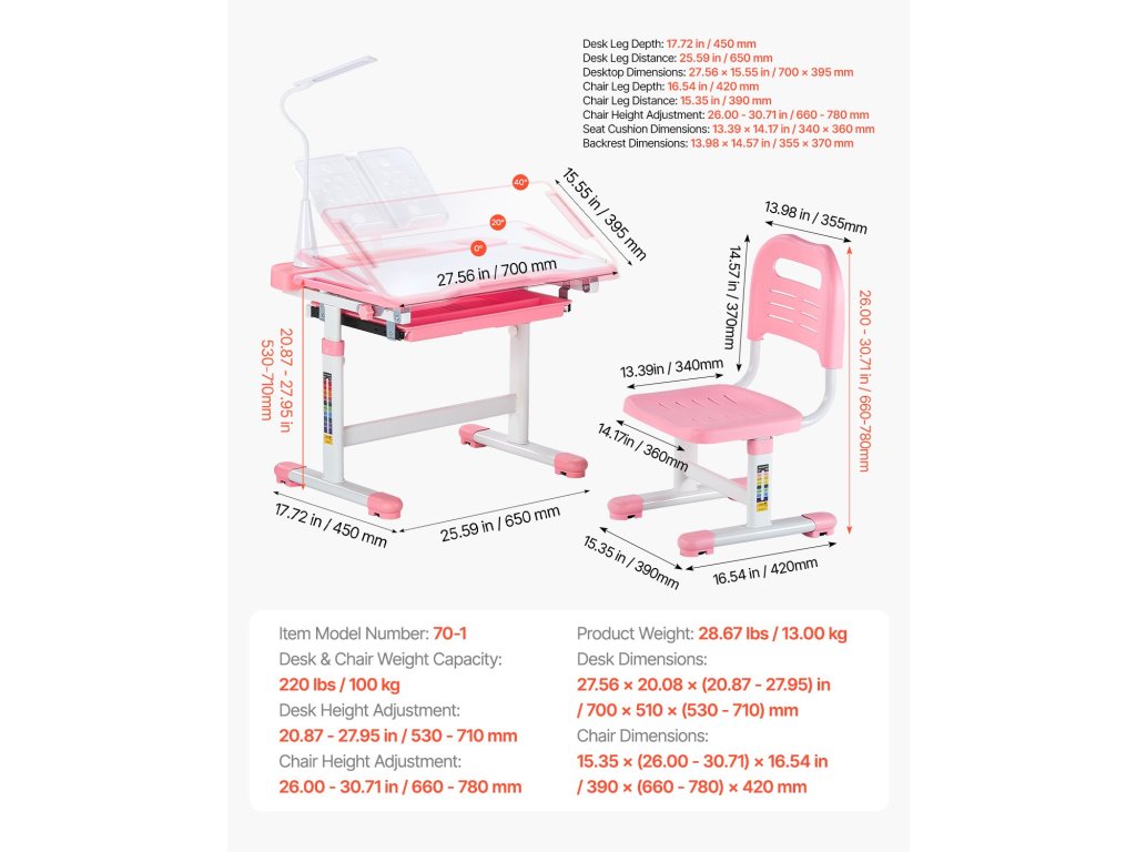 Gyerekasztal és szék lámpával, állítható magasságú, 0-40°-ban dönthető