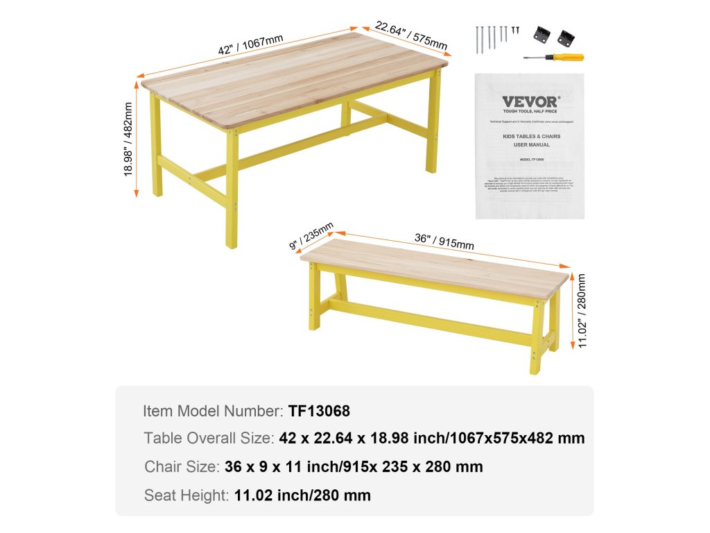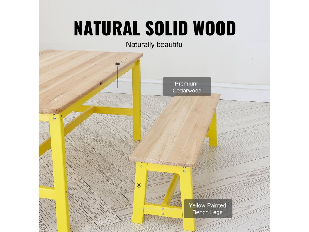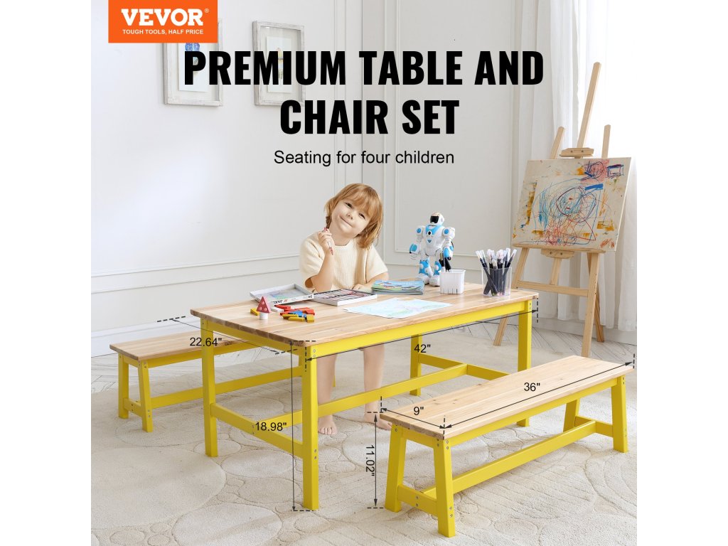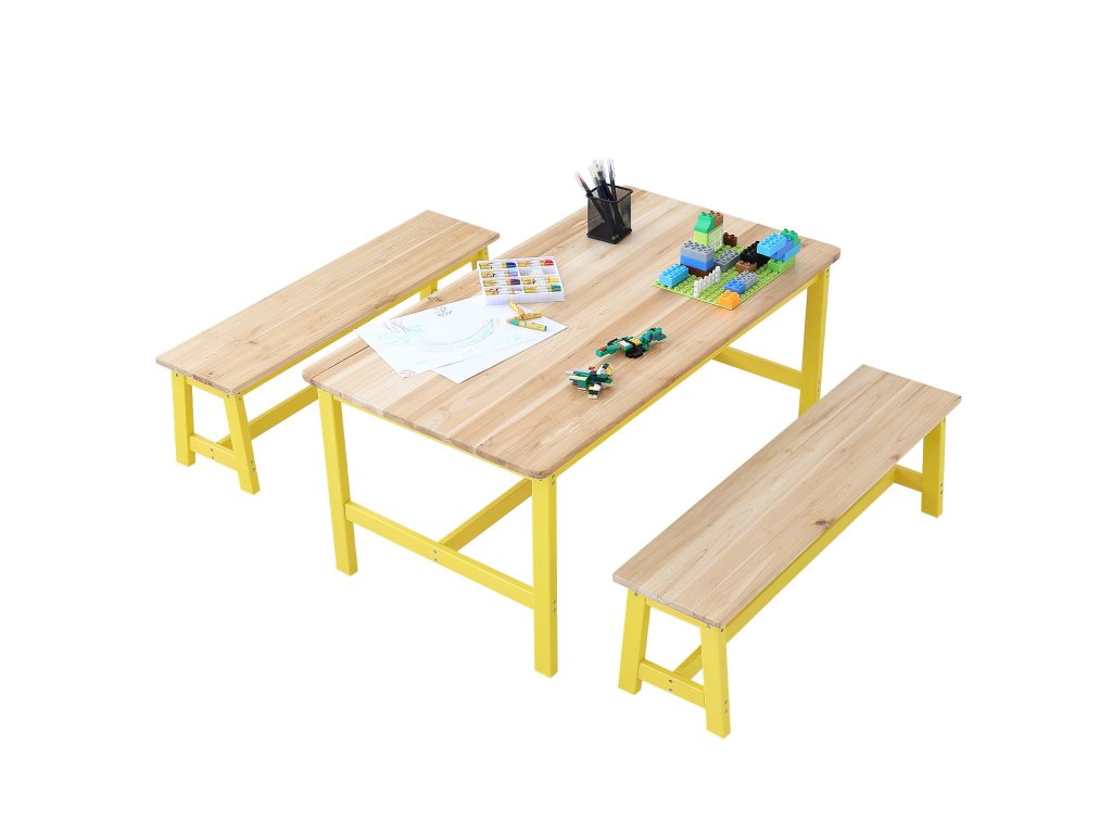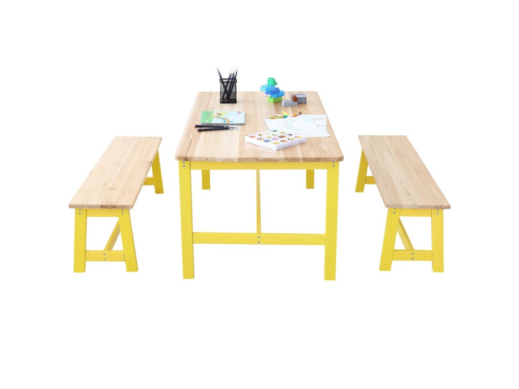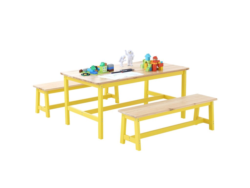 Ez a kisgyermekasztal és székkészlet a világos fa és a sárga színek kellemes kombinációjával rendelkezik, egyszerű és elegáns stílust teremtve, amely számos környezethez illik. Tartós fából készült, ami növeli a tartósságát.
