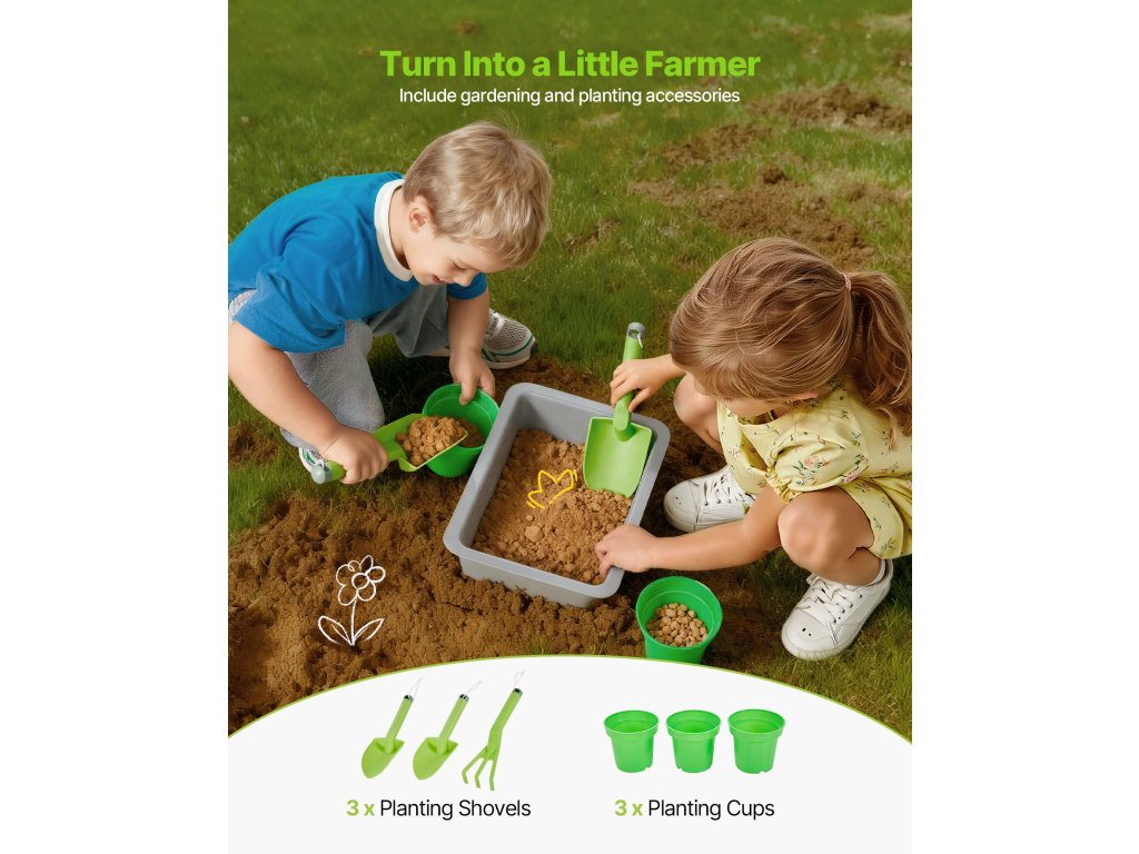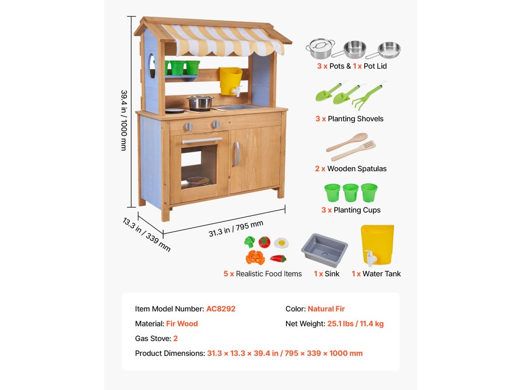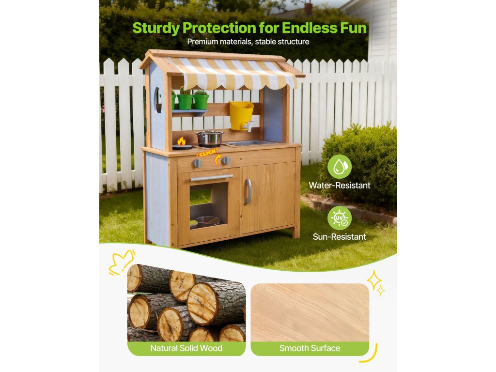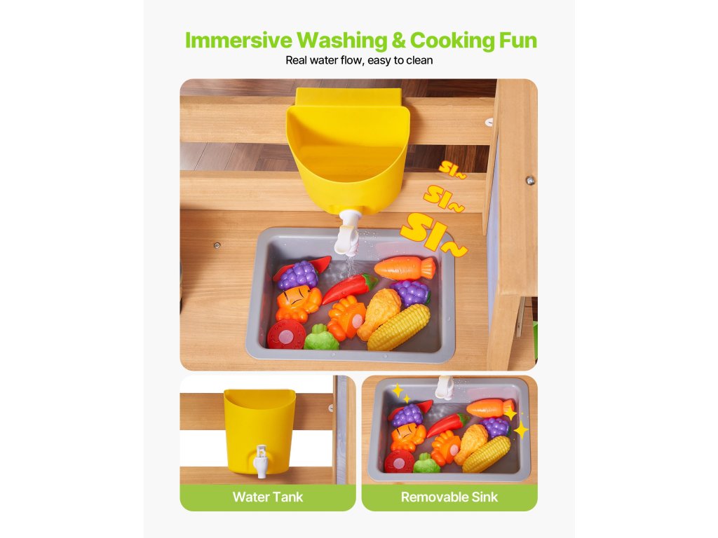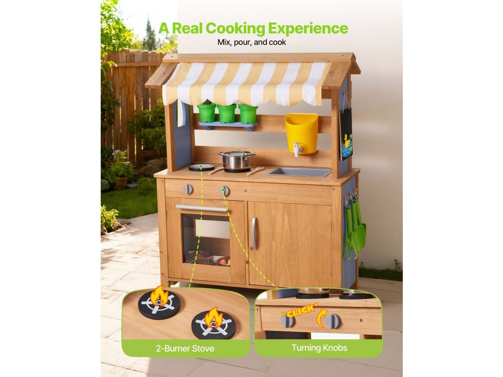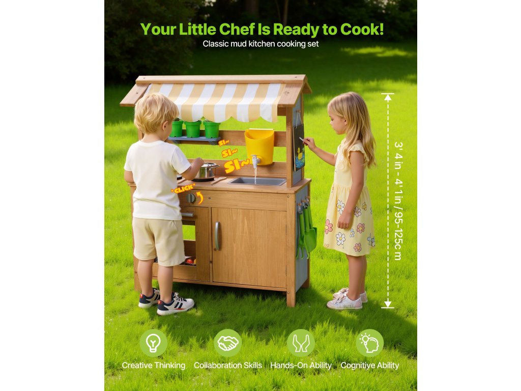 Ezt a sárral, vízzel és a természettel való játékra tervezett játszókonyhát a szabadban tervezték. Hagyja, hogy gyermeke felfedezze és megfőzze a sarat, mint egy igazi szakács, beindítva kreativitását és fantáziáját!