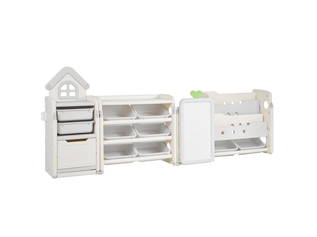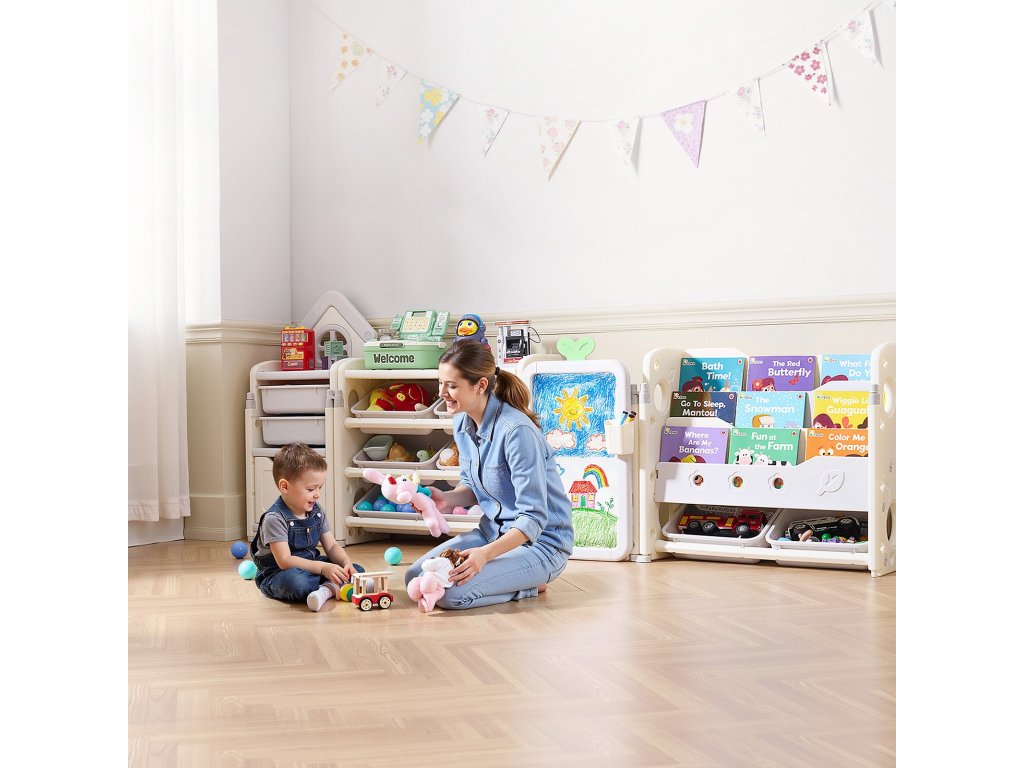 Ez a rendszerező tartalmaz egy játékkiállító területet, egy könyvtároló részt, egy tárolóterületet, egy rajzterületet és egy babatároló területet, amely rengeteg helyet biztosít a játékoknak, könyveknek, írószereknek, jegyzetfüzeteknek és egyebeknek.