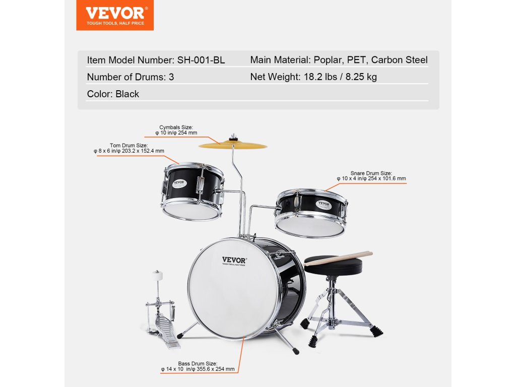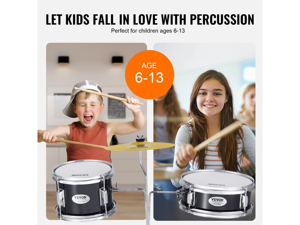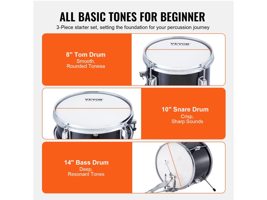 A 6-13 éves korosztály számára tervezett gyermek dobkészletünk egy 8'' tom dobot, egy 10'' kisdobot és egy 14'' nagydobot tartalmaz. Kiváló minőségű nyárfa dobhéjakkal és PET dobfejekkel dobjaink tiszta és dinamikus hangzást biztosítanak. Emelje meg gyermeke zenei élményét most!