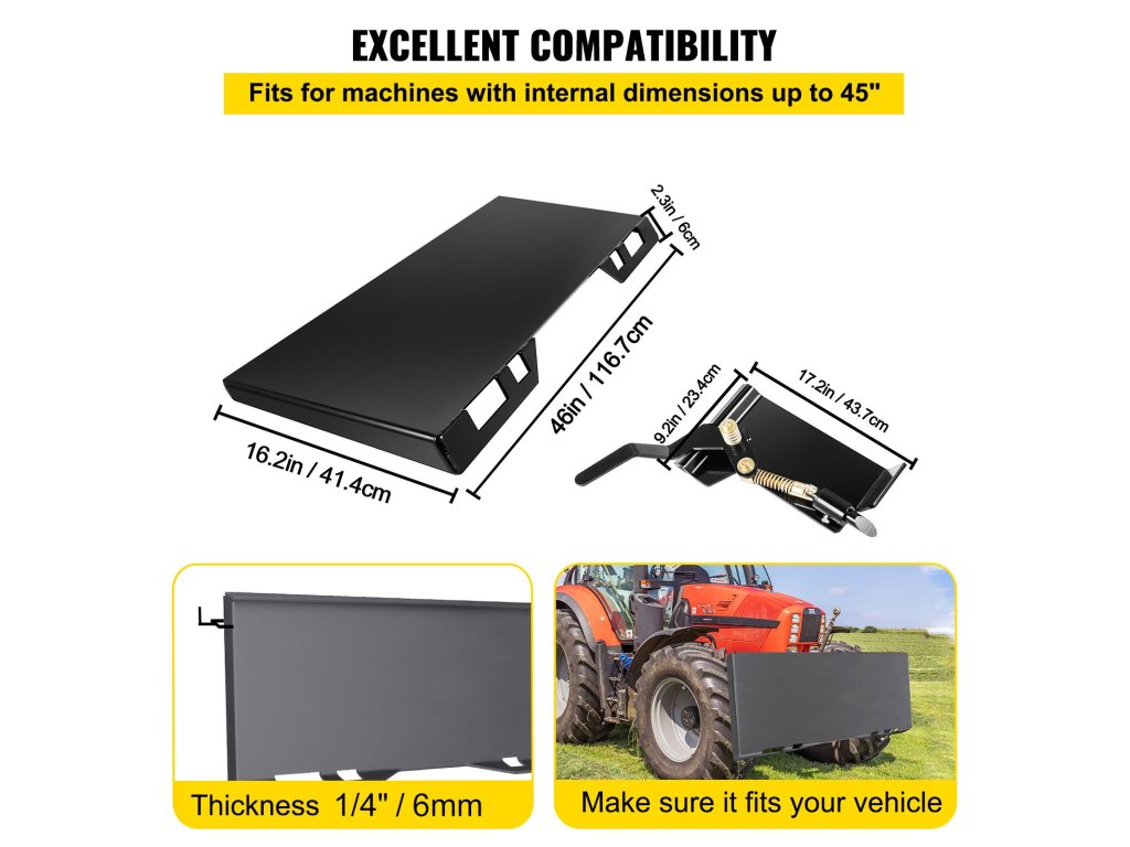 A csúszásgátló lemez 1/4" vastag és 45" széles. Univerzálisan kompatibilis a legfeljebb 45 hüvelykes belső mérettel rendelkező rakodókkal és traktorokkal, beleértve az olyan márkákat, mint a John Deere, Kubota, Bobcat és Mahindra.