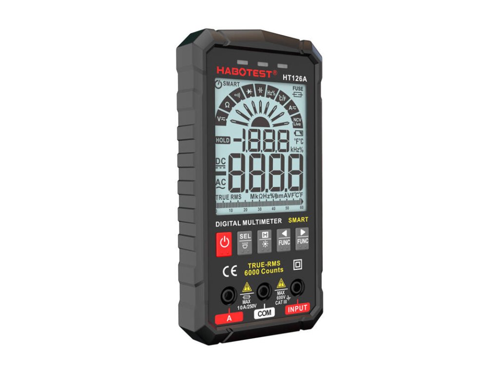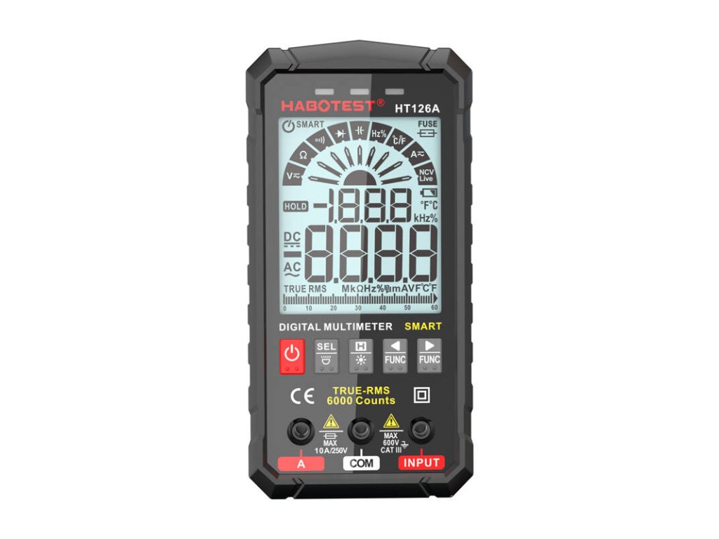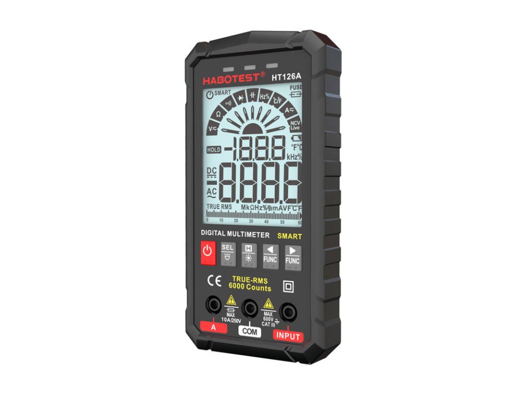 A HT126A egy intelligens és tartós multiméter a Habotesttől. Pontos mérés jellemzi, kültéren is használható. Nagy kijelzővel és szilikon gombokkal rendelkezik - egyszerű és kényelmes használat. Kompakt és könnyű - LED-es zseblámpával is rendelkezik, amely lehetővé teszi, hogy sötét helyen is dolgozhasson. A működtetéséhez 4 db 1,5 V-os AAA elemre van szükség. Ezek azonban nem tartoznak a csomaghoz, és külön kell megvásárolni őket. Használhatja feszültség, ellenállás, kapacitás stb. mérésére.