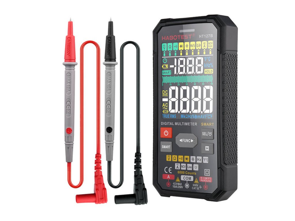 A Habotest HT127B digitális univerzális multiméter egy praktikus készülék, amely meglepi Önt a képességeinek széles skálájával. Lehetővé teszi többek között a váltó- és egyenfeszültség és -áram, ellenállás, hőmérséklet vagy kapacitás mérését nagy pontossággal. Ezen kívül Éles teszt funkciót is kínál, lehetővé teszi a diódák tesztelését, az érintésmentes feszültség (NCV) érzékelését és még sok minden mást. Fontos, hogy a multiméter praktikus gombokkal rendelkezik, amelyekkel hatékonyan kiválaszthatja a funkciót.