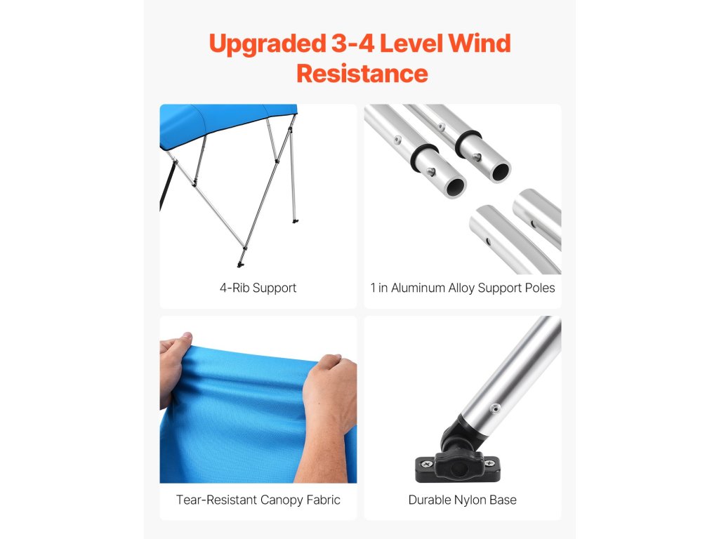 Az 1" vastag alumíniumötvözetből készült tartó rudakkal és tartós PP talppal ez a csónak bimini tető biztonságosan rögzül a hajójához. A korrózióálló anyagok biztosítják, hogy nem fog rozsdásodni a tengervíz vagy az eső miatt.