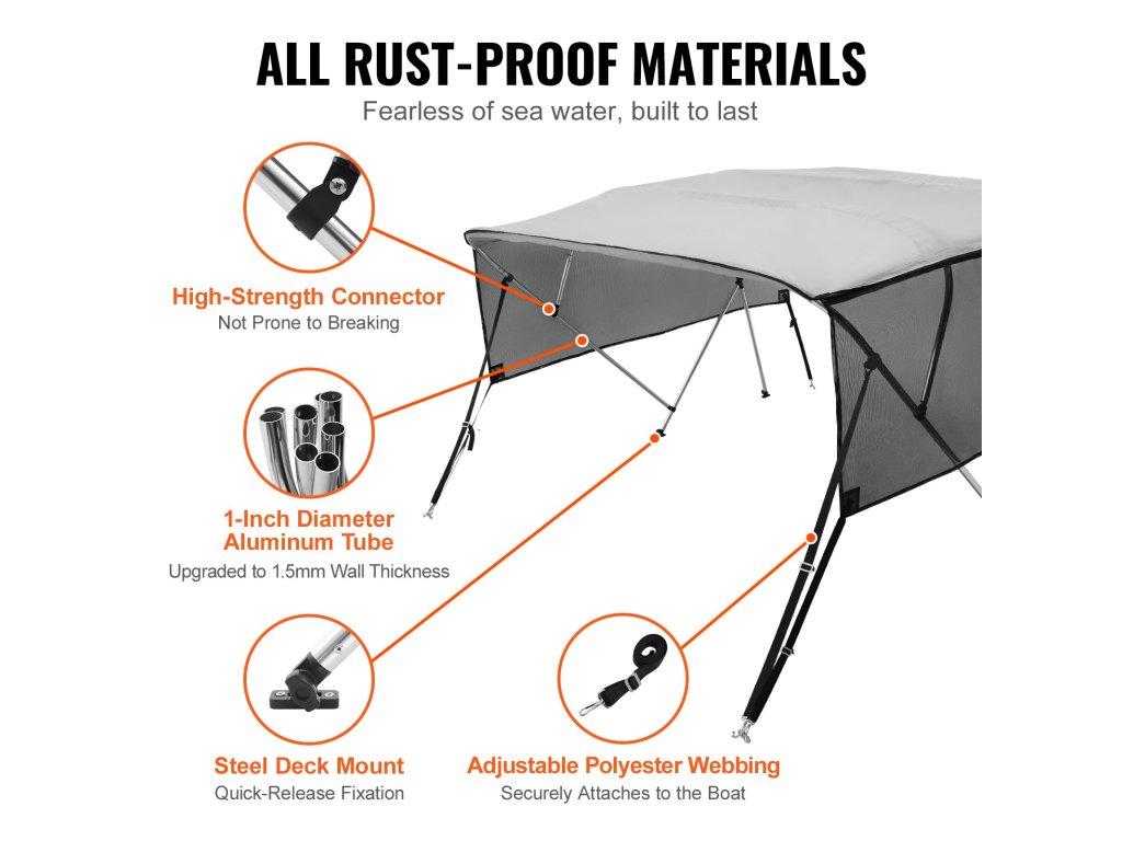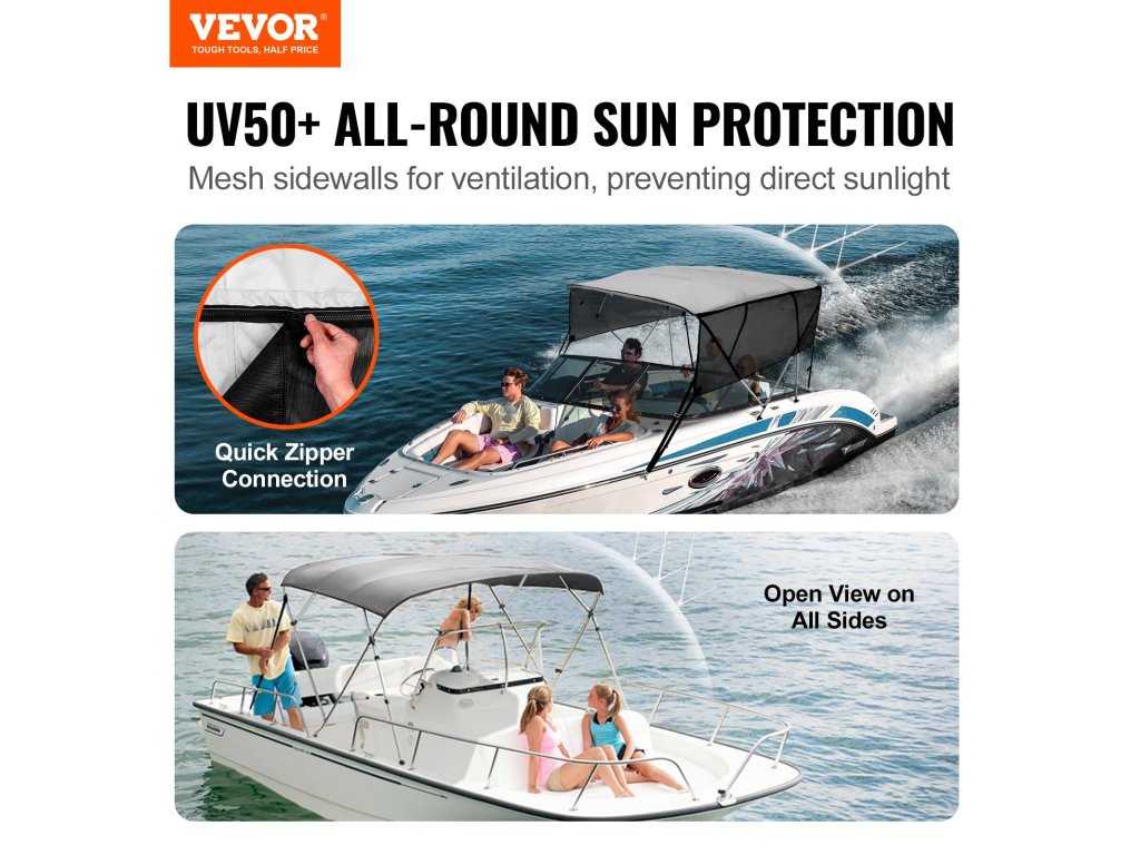 A biminitető huzat 600D poliészterből készült. Levehető hálós oldalfalakkal és UV50+ védelemmel rendelkezik. Merev alumíniumötvözetből készült váza stabilitást biztosít erős szélben. Többféle méretben kapható, így a hajók széles skálájához ideális, és minden szükséges tartozékot tartalmaz.