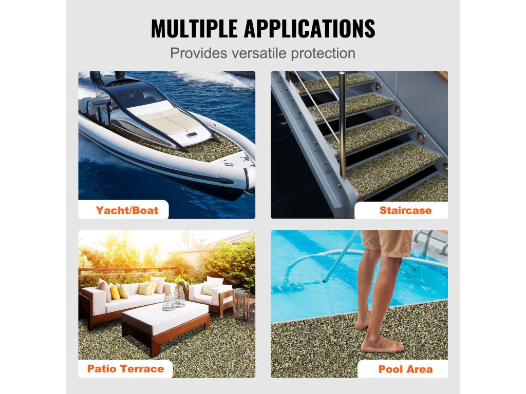 Négy színben kapható: terepszínű, szürke, sötétszürke és barna. A VEVOR hajódeszka habszivacsok 11,62 m² és 31,02 m² közötti méretekben alkalmasak lépcsőkhöz, hajókhoz vagy medenceteraszokhoz.