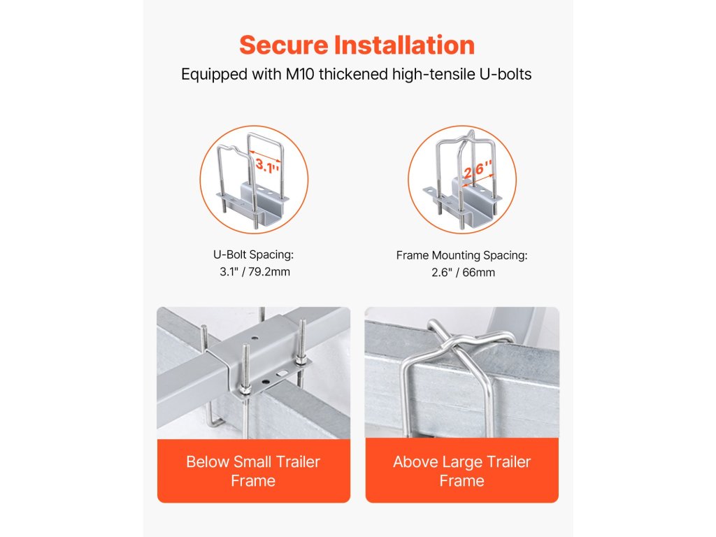 A VEVOR csónak utánfutó rúdsor készlet két rögzítési lehetőséggel rendelkezik, állítható U-csavarokkal, hogy illeszkedjen a különböző szélességű utánfutógerendákhoz. Ez a kialakítás biztosítja a biztonságos és stabil felszerelést, megakadályozva, hogy a vezető rudak meglazuljanak vagy meginogjanak szállítás közben.