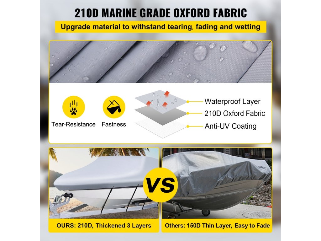 Plachta na loď VEVOR je vyrobená z tkaniny 210D Oxford. Tento materiál je odolný a trvanlivý. Odoláva nepriaznivému počasiu bez roztrhnutia. To je nevyhnutné na ochranu vašej lode pred búrkami alebo silným vetrom. Vďaka svojej pevnosti sa plachta ľahko neopotrebováva. To z nej robí skvelú investíciu na dlhodobé používanie. Chráni vašu loď pred búrkami a silným vetrom. Naše plachtové kryty sú navrhnuté tak, aby odolali ostrým hranám a hrubému zaobchádzaniu. Tieto vlastnosti zaručujú, že vaše plavidlo zostane v bezpečí a zakryté. Okrem toho vysoká odolnosť krytu pridáva ďalšiu vrstvu ochrany. Môžete sa spoľahnúť, že tento kryt ochráni vašu loď. Nezáleží na tom, aký typ lode vlastníte. Hrúbka materiálu prispieva k jeho odolnosti. Stáva sa tak nesmierne cenným doplnkom vašej každodennej údržby.