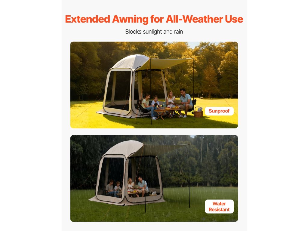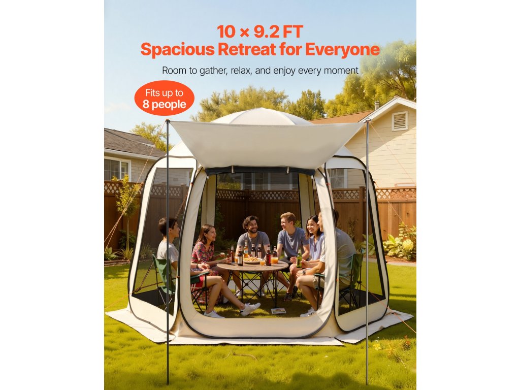 Ez a 10 x 9,2 láb tágas méretekkel rendelkező pop-up sátor képernyővel és kis baldachinnal kényelmesen elfér akár 8 ember. Tökéletes a székek és felszerelések felállításához, és hűvös, árnyékos helyet biztosít a szabadtéri pihenéshez.