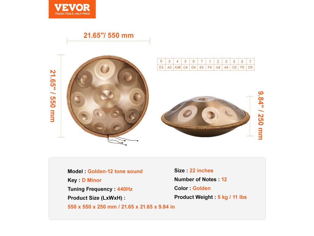 Ez a 22 hüvelykes d-moll kézdob kiváló minőségű szénacélból készült, és 12 hangot fed le, amelyek mély aranyszínűek. Ideális a kezdők számára a gyors kezdéshez, és kellemes, tiszta és hosszan tartó hangjának köszönhetően maximális élvezetet nyújt a zenélésből.