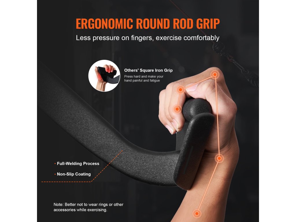 A kerek rúd markolat szakértelemmel készült, teljes hegesztési eljárással és csúszásmentes kivitelben, amely minimálisra csökkenti az ujjakra és az ujjpercekre gyakorolt nyomást, növelve a gyakorlatok hatékonyságát és kényelmét.