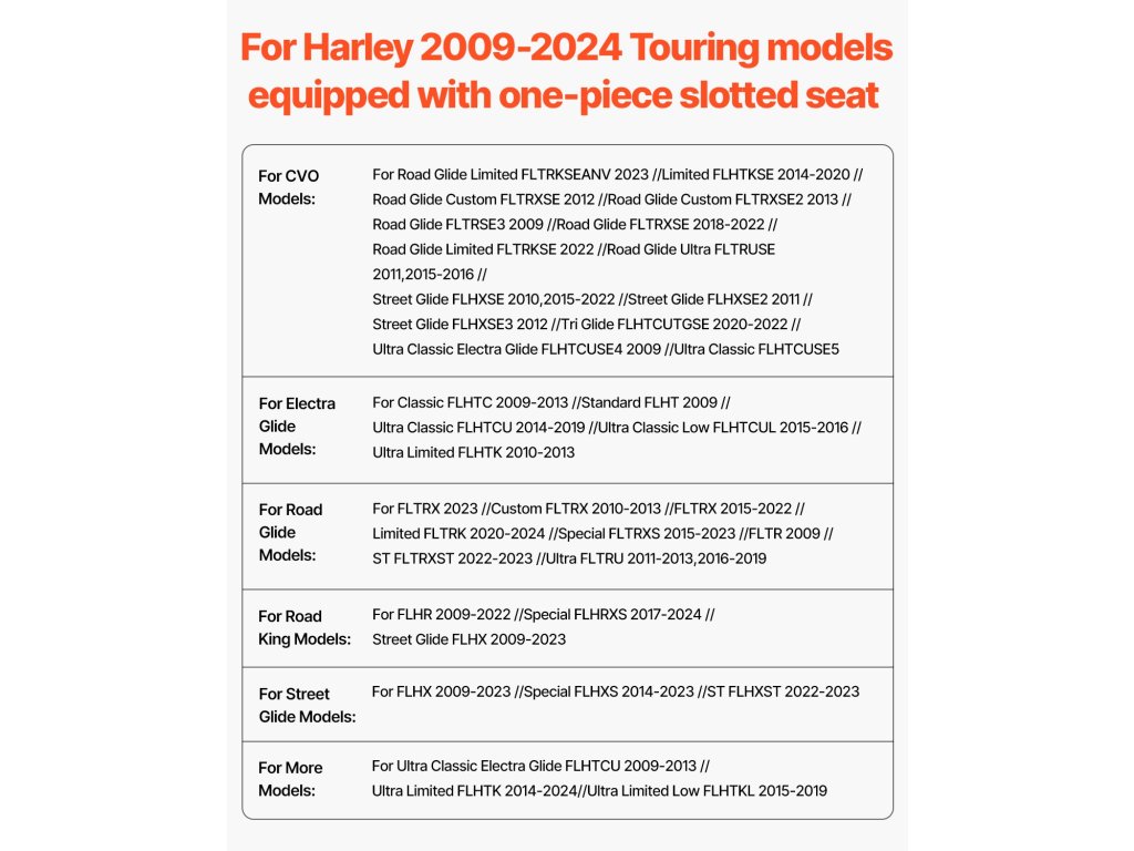 | Kompatibilis modell | Harley 2009-2024 Touring modellek egy darabból álló, bordázott üléssel felszerelve |