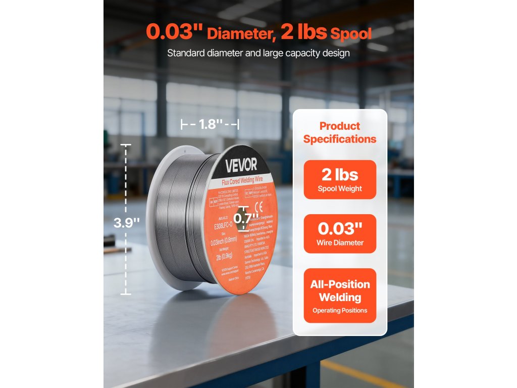 A VEVOR 0,03" 2 lbs E308LFC-O folyékony töltőanyagú hegesztőhuzal feszes, egyenletes hegesztési varratokat biztosít sima huzaltovábbítással és alacsony fröccsenéssel. Támogatja a gázmentes hegesztést minden helyzetben és a nagy szakítószilárdságot a megbízható teljesítmény érdekében az autóipari, mérnöki és barkácshegesztési projektekben.