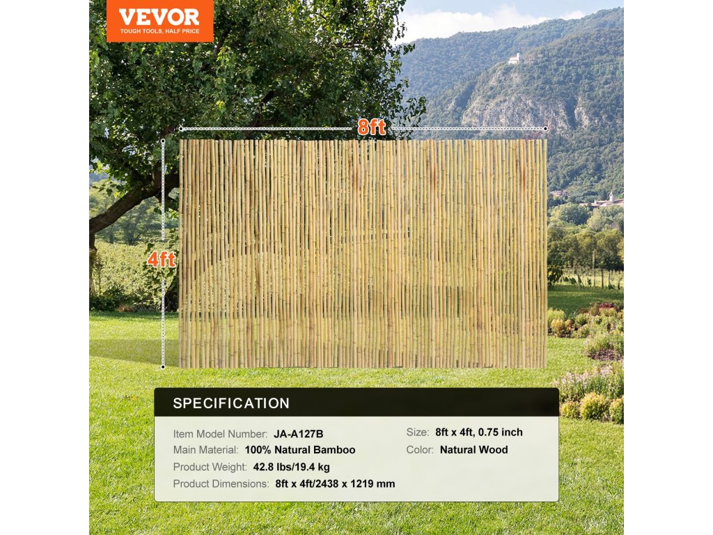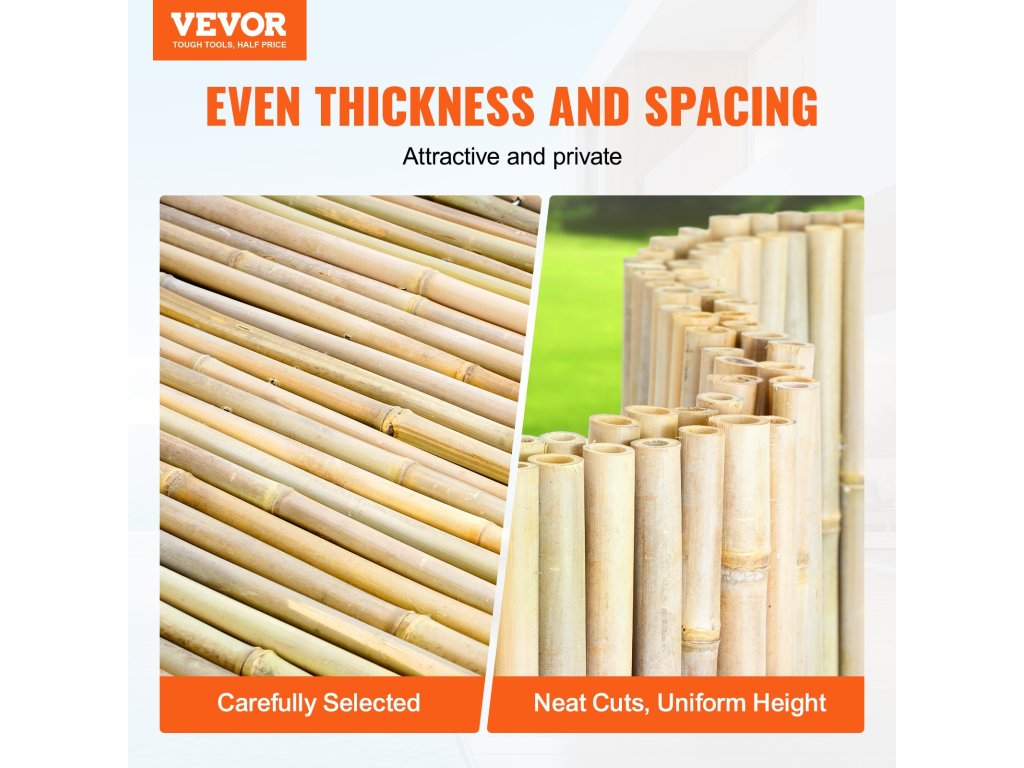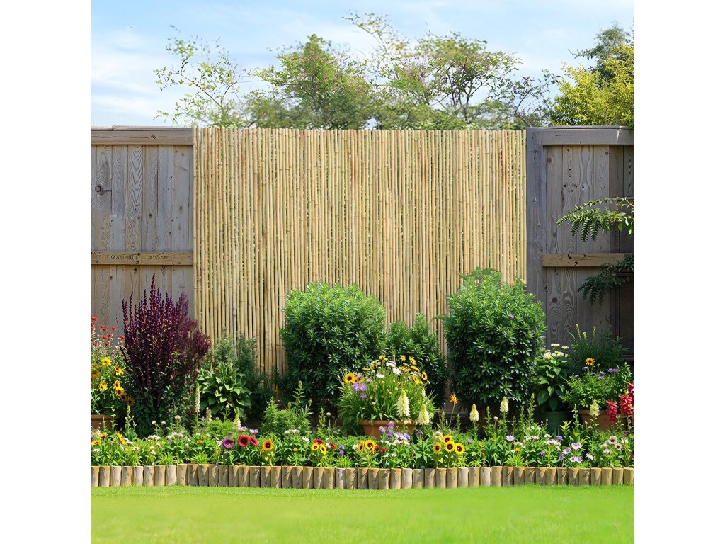 Bambuszkerítésünk 100%-ban természetes bambuszból készül, és egyenletes méretű, egyenletes távolságra elhelyezett bambuszoszlopokkal rendelkezik, amelyek egységes és esztétikus megjelenést biztosítanak. Kizárólag az Ön és családja számára teremt privát teret!