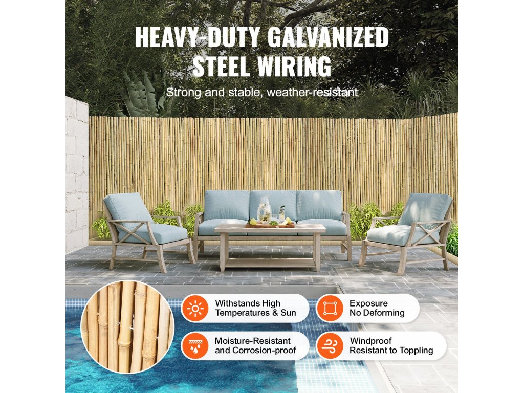 Minden bambuszrúd hagyományos kezelésen esik át, beleértve a magas hőmérsékleten történő gőzölést, mosást és természetes szárítást. A bambuszkerítés, amelyet vastag horganyzott acélhuzalok kötnek össze, korrózióálló és erős szerkezetet biztosít, meghosszabbítva az élettartamát.
