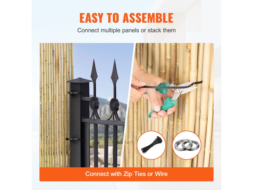 Egyszerűen nyissa ki a csomagot, és szerelje fel a tekercselt bambuszkerítést kötőelemek (például zip-kötegelő vagy drót) segítségével. Gyorsan felállítható egyenes vagy íves felületeken, és nagyobb vagy biztonságosabb és privát telepítésekhez összeilleszthető vagy átlapolható.