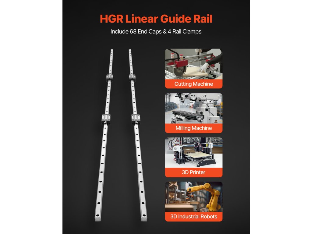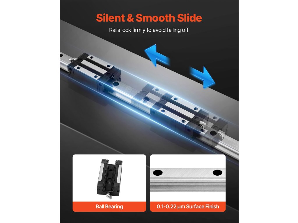 Tartalmaz 2 lineáris sínt, 4 csúszó blokkot, 68 végzáró sapkát és 4 sínrögzítőt. A szénacél síneket precíziós rögzítőfuratokkal és furattávolsággal terveztük a csökkentett rezgés és a csendes lineáris mozgás biztosítása érdekében. Minden egyes ötvözött acélból készült csúszóblokk golyóscsapágyakkal van ellátva az elakadásmentes mozgás érdekében.