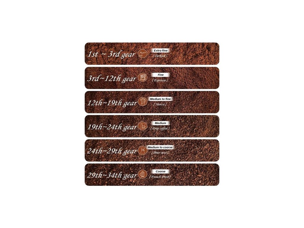 A HiBREW G3 automata kávébabdaráló 34 méretig képes őrölni, így az őrlés egyenletes.