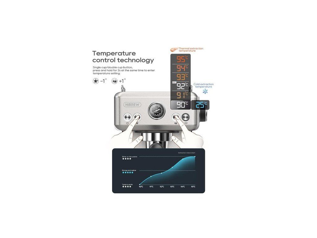 A HiBREW H10A eszpresszógép nagy teljesítményű, 20 bar nyomású nagynyomású szivattyút és egyenletesen nedves, gőz előtti infúziós technológiát használ a kávéhab teljes extrakciójának biztosítása érdekében. Erős és tartós őrölt rozsdamentes acél testtel, stabil szerkezettel, szennyeződésállósággal és könnyű tisztítással rendelkezik.