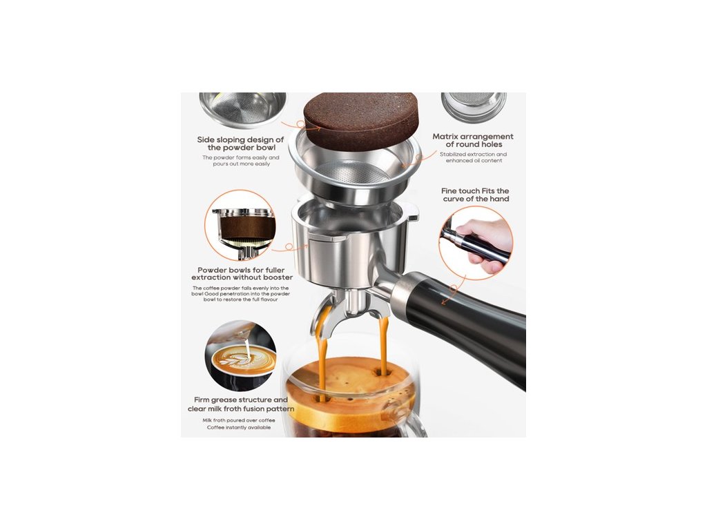 | A csomag tartalma | 1 x Kávéfőző 1 x Poros tál egy csészéhez 1 x Poros tál két csészéhez 1 x Porkanál ecsetfejjel 1 x 350ml kancsó 1 x 58mm-es kávépamper 1 x 58mm-es fogantyú-port szűrő 1 x Felhasználói kézikönyv |