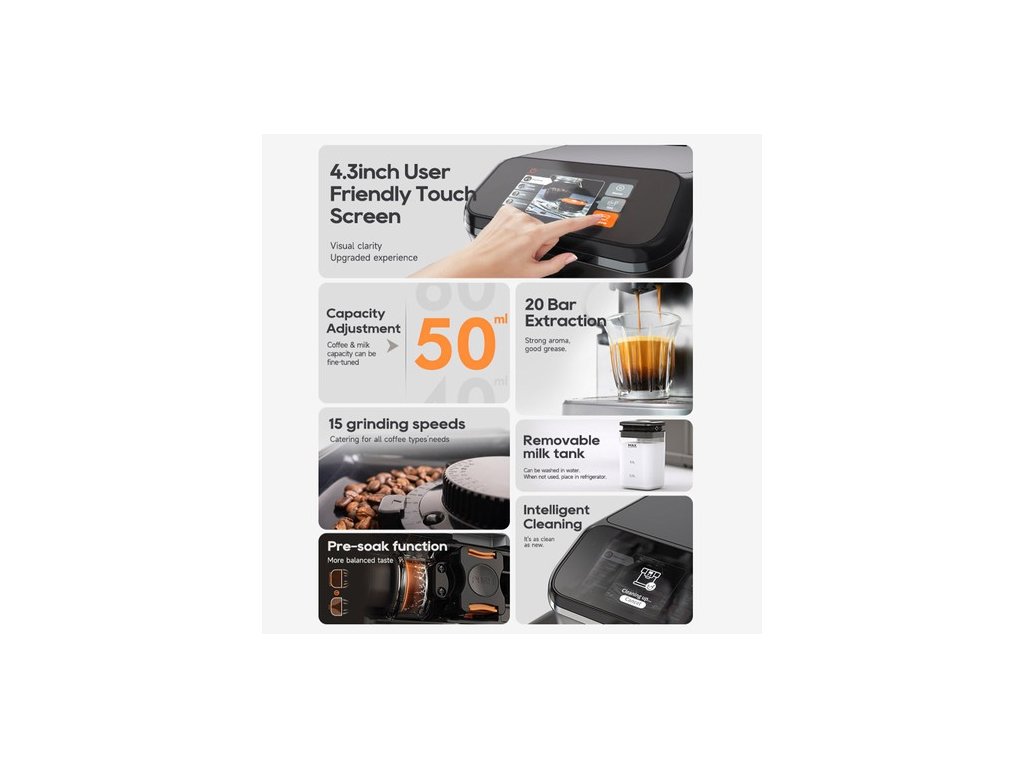 - Tejrendszer: 1,5 literes kivehető tartály automatikus habosítással