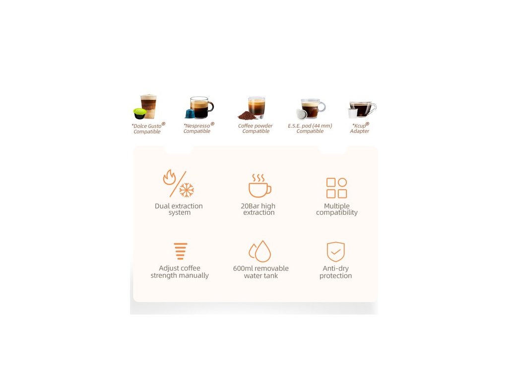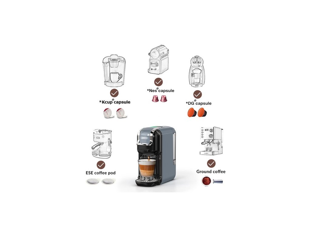 Ez a kapszulás kávéfőző tökéletesen kompatibilis a Kcup* Pod, Nes* OriginalLine Capsule, DG* Capsule, E.S.E. Pod és Espresso Powder kávéfőzőkkel. Nem kell különböző kapszulák miatt különböző kávégépeket vásárolnia, amivel rengeteg pénzt takaríthat meg.