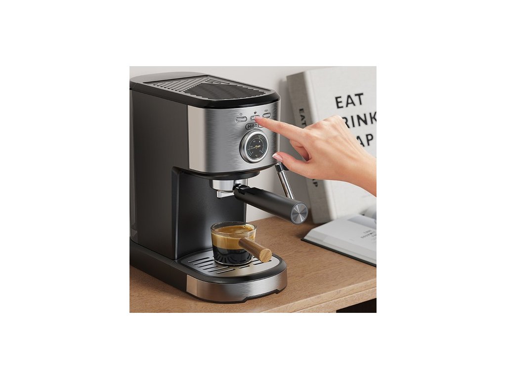 | Specifikáció | Névleges teljesítmény: 1100W Szivattyúnyomás: 15 Bar Névleges feszültség: 15Bar Névleges feszültség: AC 220-240V 50Hz/60Hz Víztartály: 1,2 l Funkció: eszpresszó, tejhabosító, csészemelegítő |
