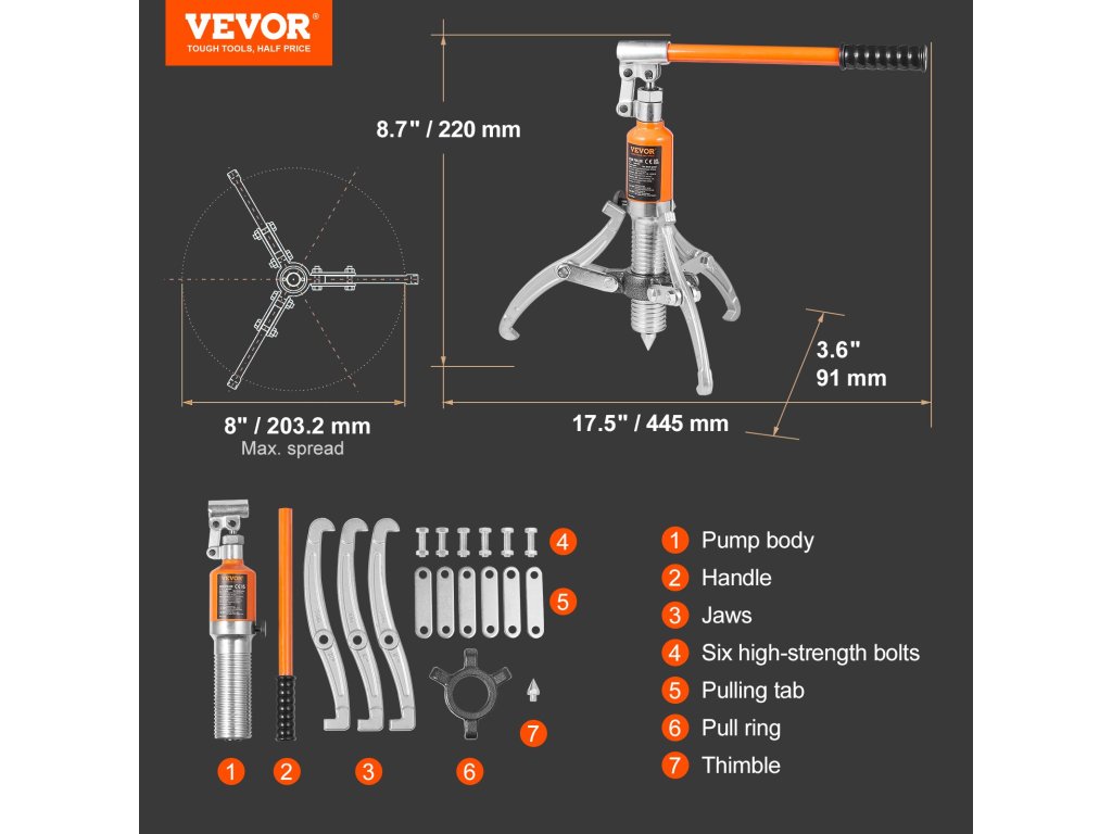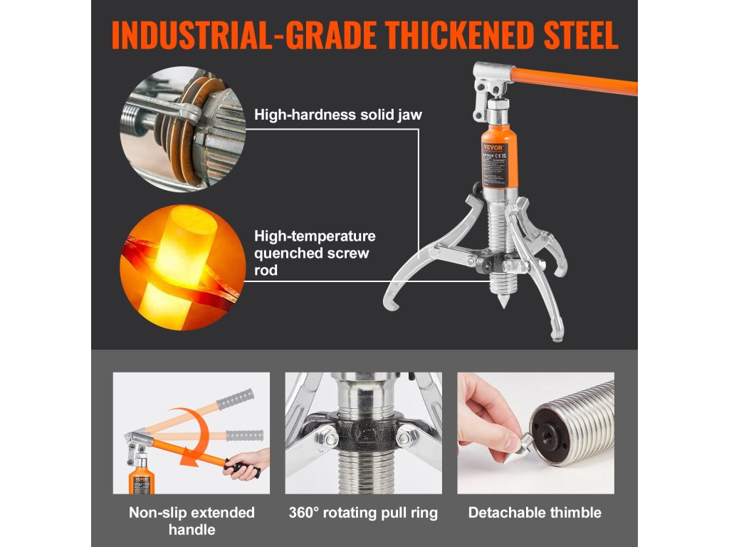 Ez a hidraulikus fogaskerékhúzó vastag és masszív testtel készült, amely nem deformálódik vagy hajlik el könnyen. A pofák erős fogantyúval rendelkeznek, és ipari minőségű acélból készültek, rozsda- és korrózióálló bevonattal, amely hosszú élettartamot biztosít.