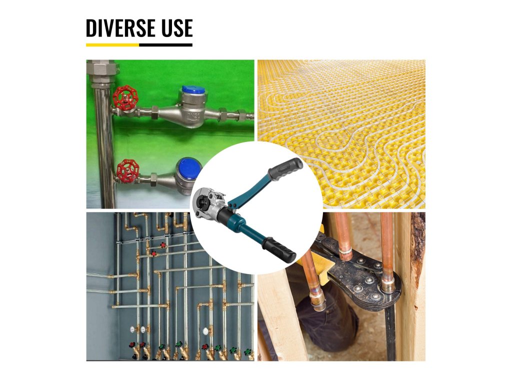 A csőcsatlakozó krimpelő szerszám alkalmas alumíniumcső, PEX cső, PB cső és réz szerelvények, réz csőcsatlakozó, rozsdamentes acél nyomóhüvely (szivárgásgátló) dugaszolásához.