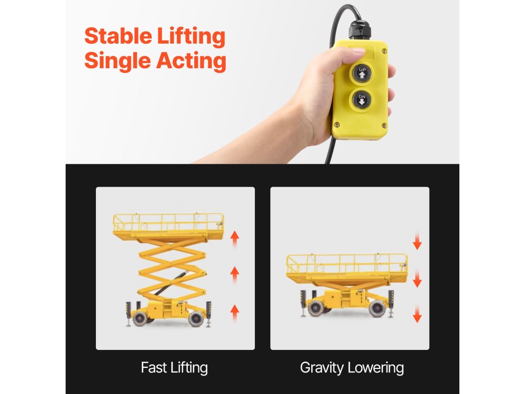 A nagyméretű szivattyútartály robusztus szivattyúval van kombinálva, amely gyorsan elindul és zökkenőmentes emelési/leengedési ciklusokat biztosít. Megszünteti a leállásokat, csökkenti a várakozási időt, és egyenletes hidraulikus erővel zökkenőmentessé teszi a napi műveleteket.