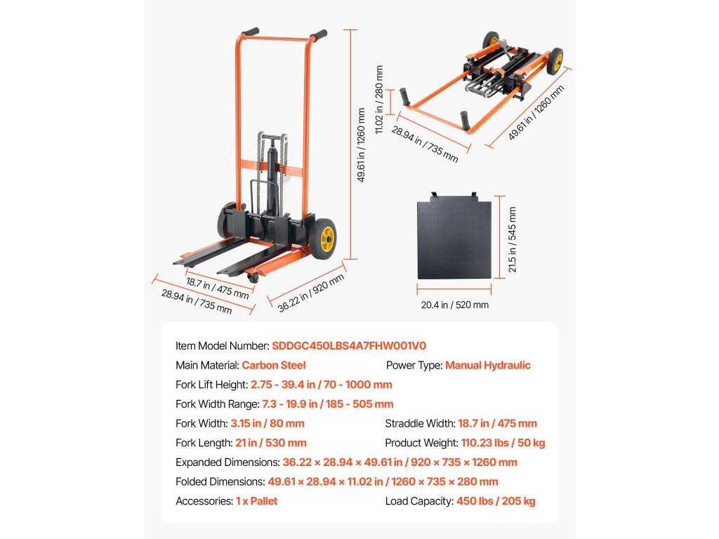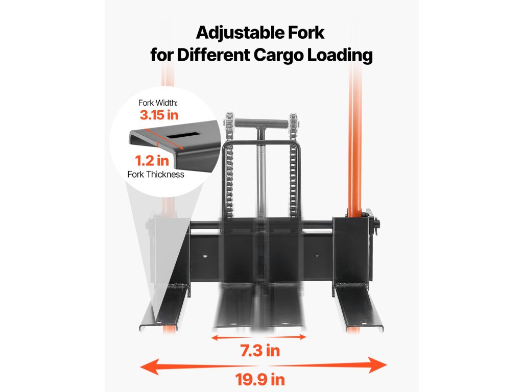 Anyagemelőnk nagy teljesítményű, tömített hidraulikaszivattyúval van felszerelve, amely minden feladatnál stabil emelést biztosít. A villák 7,3 és 19,9 hüvelyk között állíthatóak, így ideális a különböző rakodási feladatokhoz.